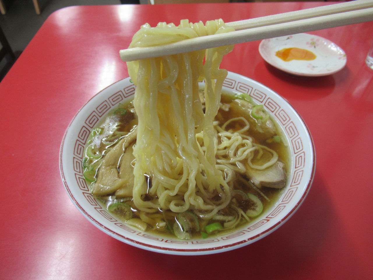 スープは、煮干しや豚骨などの旨味が感じられ、濃い目の醤油スープには少し油が浮いています。