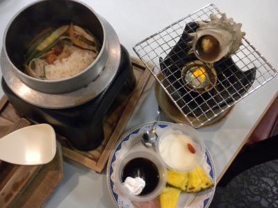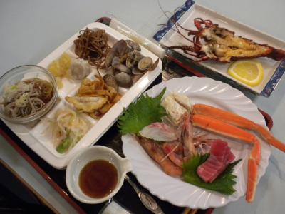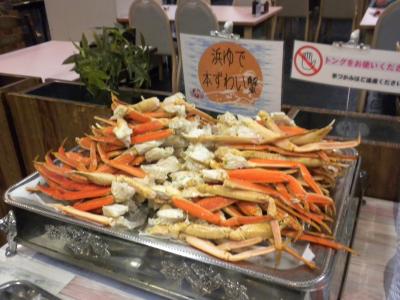 夕飯は蟹の足や魚介類の浜焼き食べ放題です。