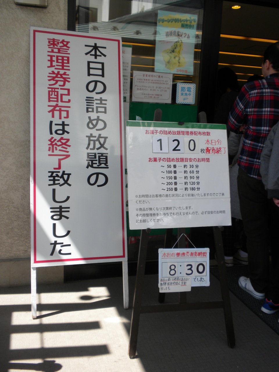 「詰め放題」は開場前から列が出来る事もあり、その日の在庫量や受け入れ可能人数で入場整理券の枚数が決まるそうです。