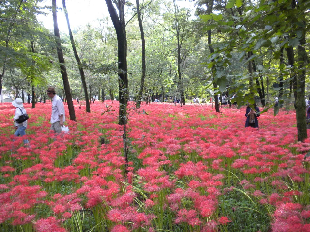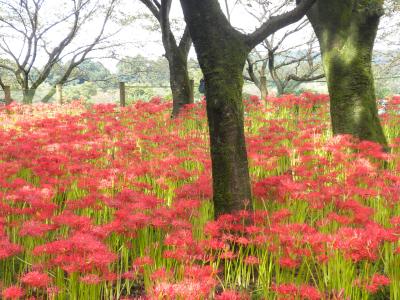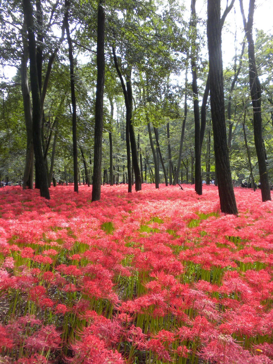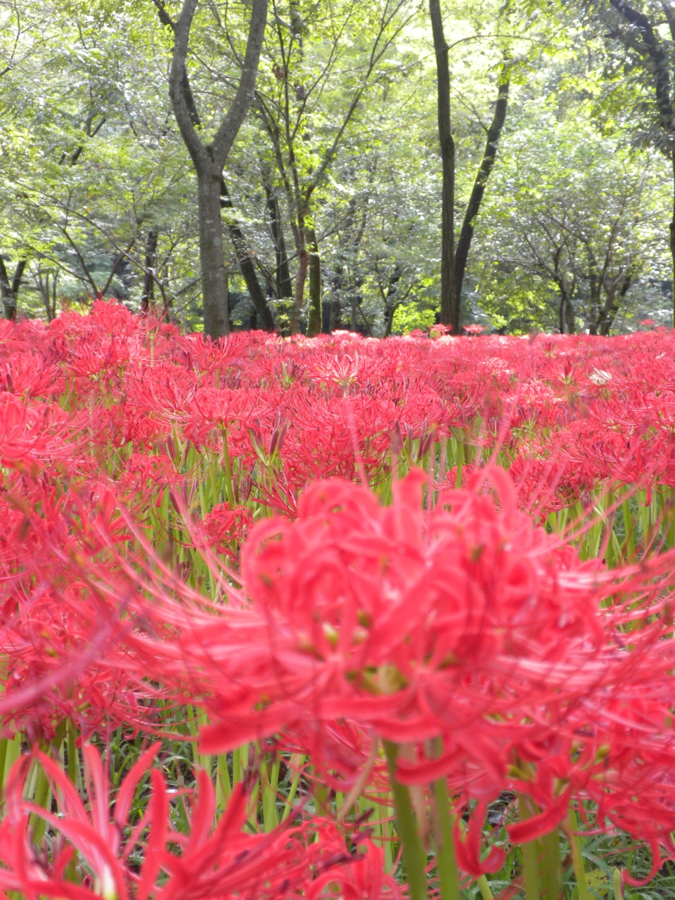 幅50m、長さ数百mに渡って木立の間に約500万株の曼珠沙華が一斉に咲き揃います。