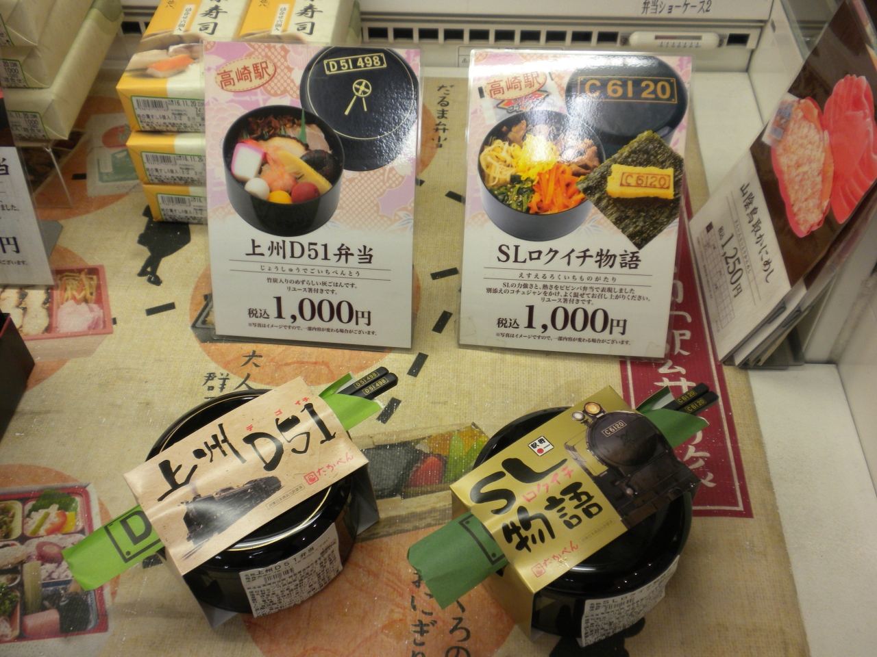 何気なく覗いた駅構内の「駅弁屋上州2号店」のショーケースには黒くて丸いSL弁当は沢山ありました。