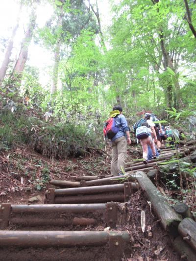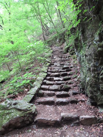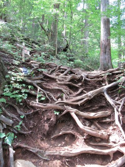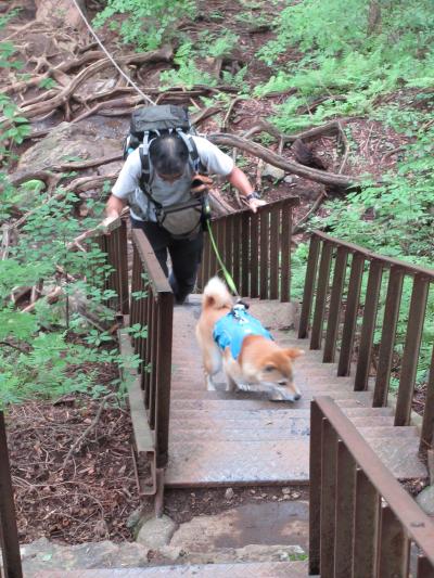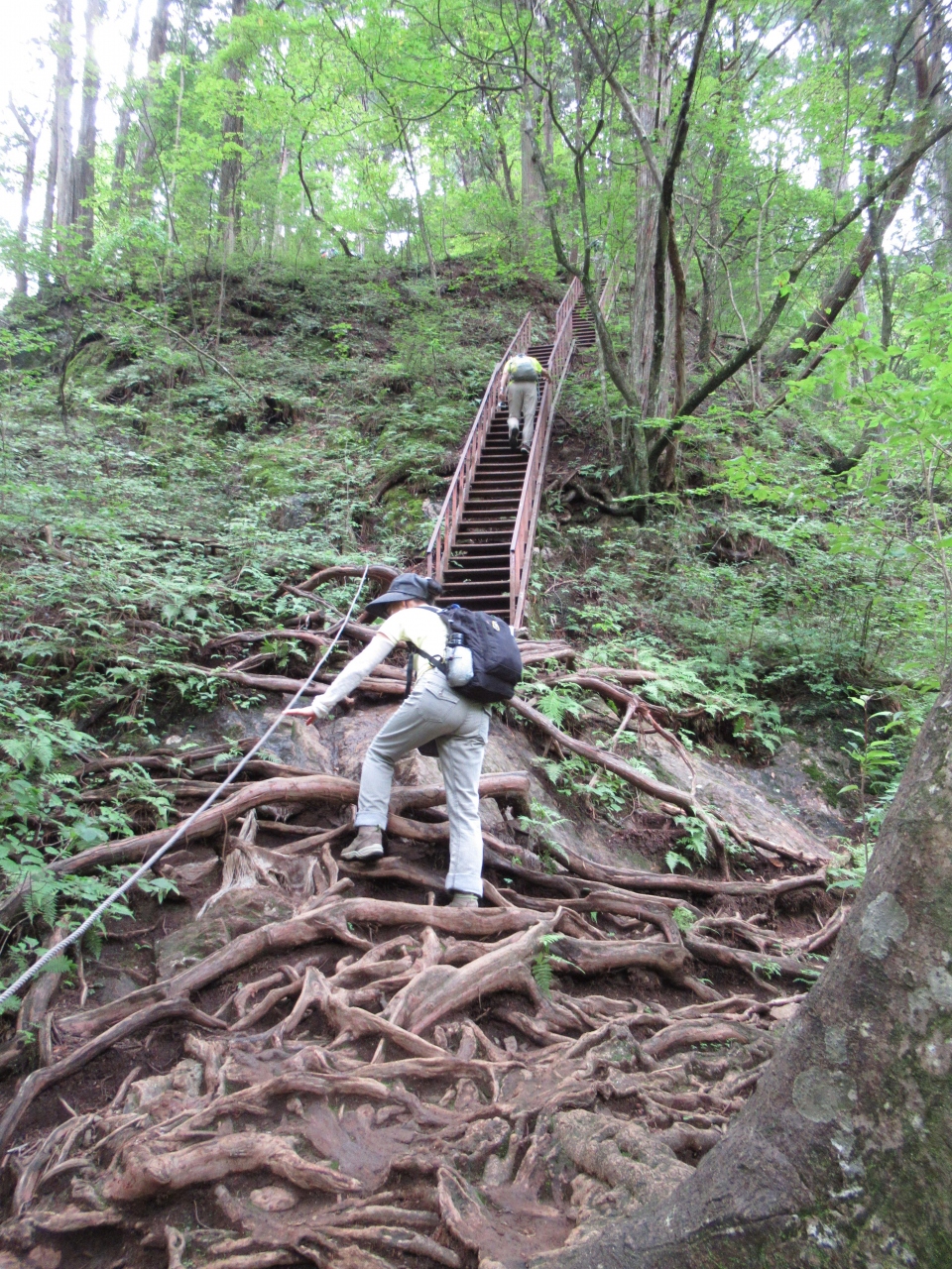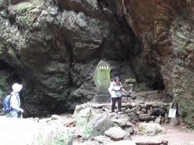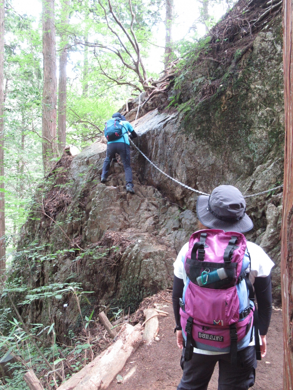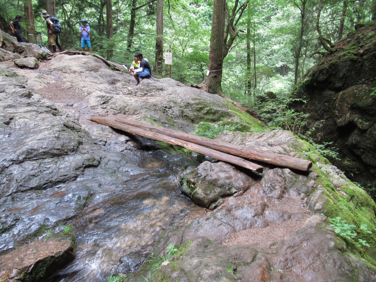 ロックガーデンハイキングの起点「七代の滝(ななよのたき)」は「天狗岩」の脇から木の根坂や鉄のハシゴを伝って降りて行きます。