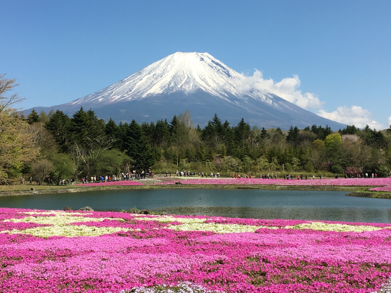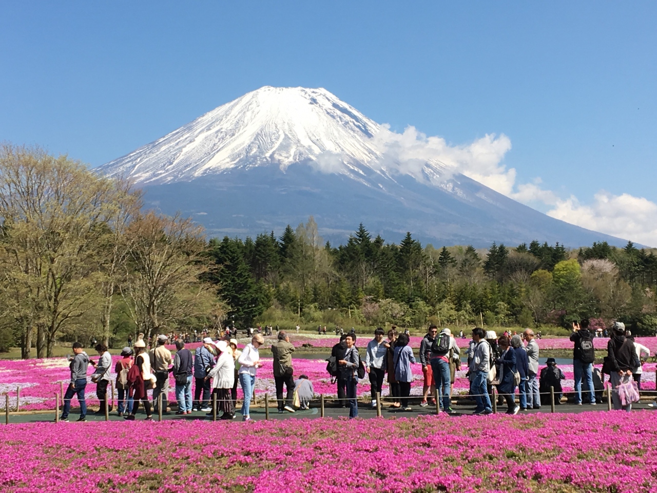 青い空と冠雪の富士山、一面の満開のピンクや白の芝桜の絨毯、その境に位置する緑の木々・・・