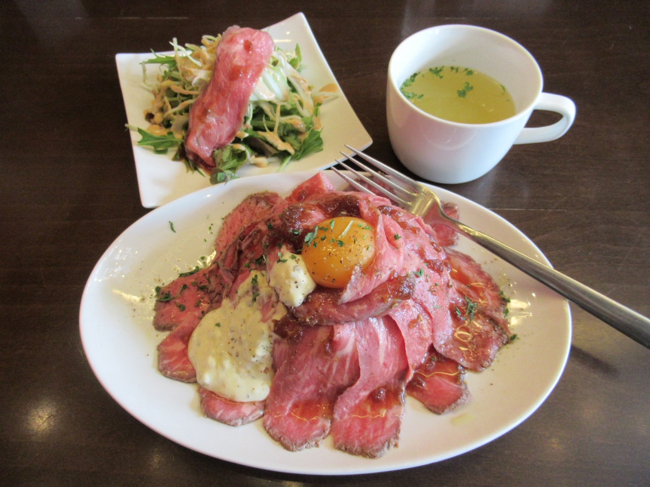 ローストビーフ丼のランチセット(990円)にはミニサラダとカップスープ付き。