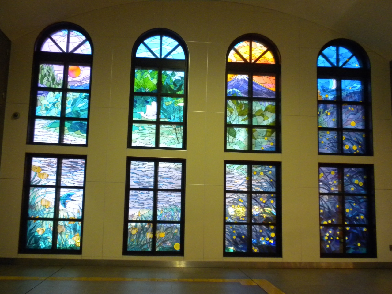 南北自由通路の南側には桜、北側には高麗川の清流をモチーフにしたステンドグラスが輝いています。