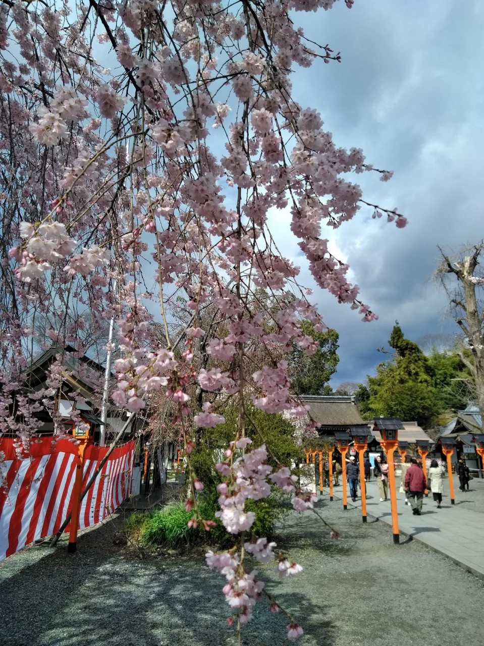 神苑以外の境内に他に桜はあまり無いのですが、種類の違う色の濃い桜3本くらいが満開でした。