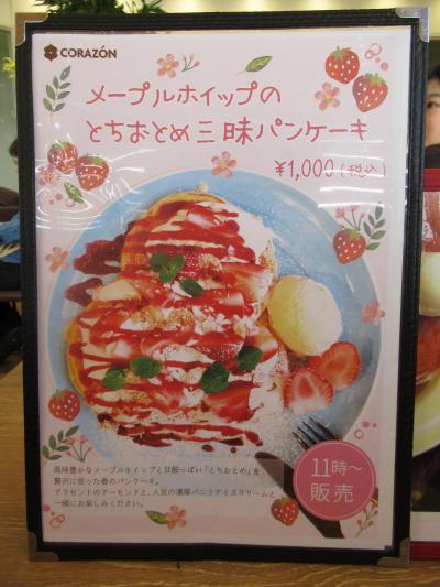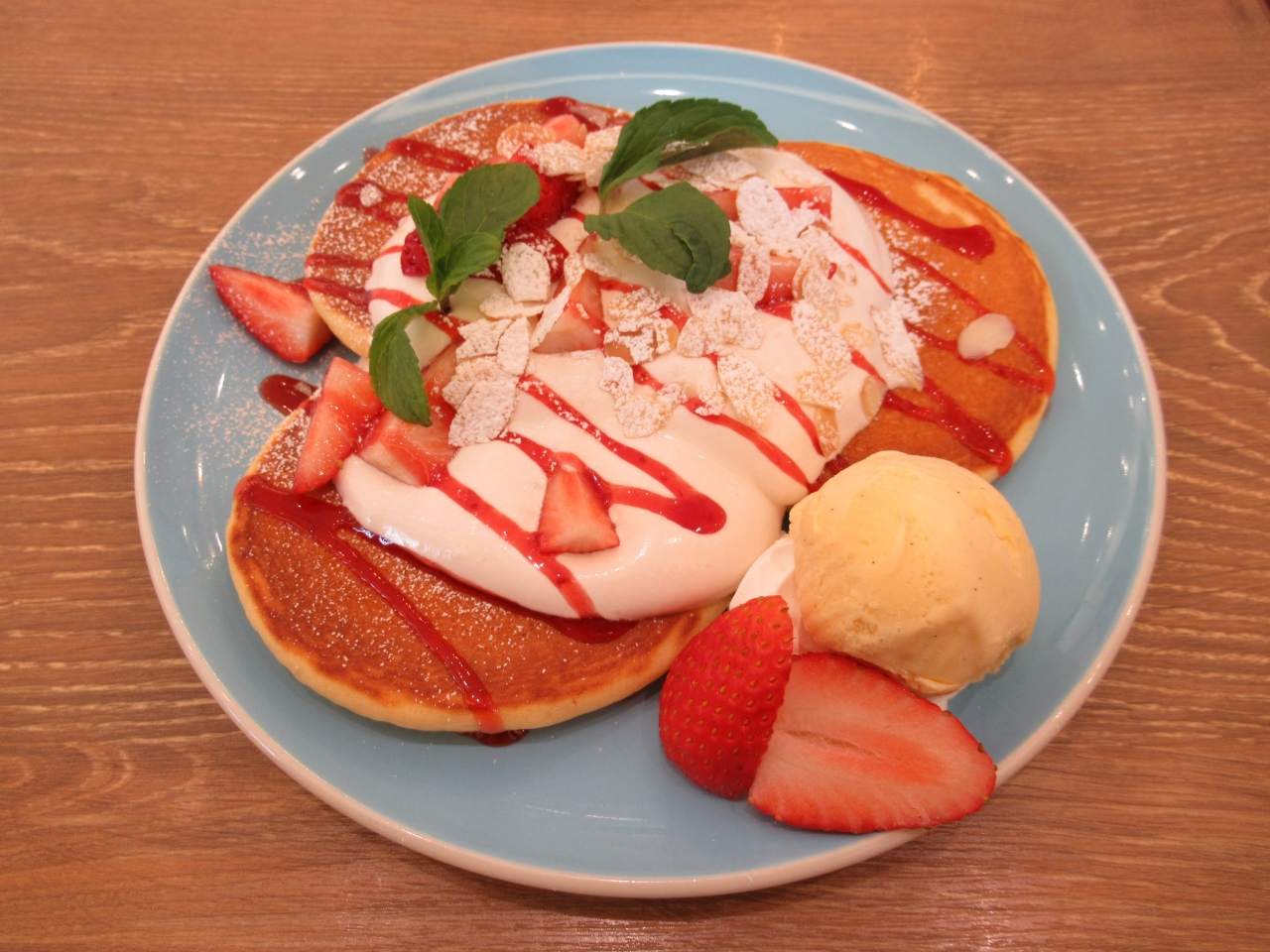 連れは季節限定「メープルホイップのとちおとめ三昧パンケーキ」、私は「生ハムサラダのパンケーキ」税込各1,000円を注文。
