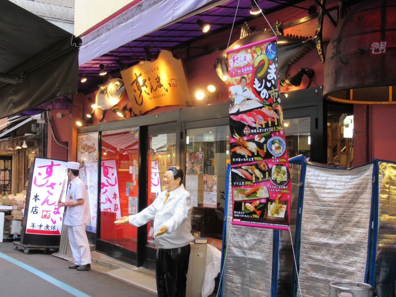 朝7時に築地場外市場の店に行きましたが、呼び込みのおにいさんが愛想よく客引きをしていました。