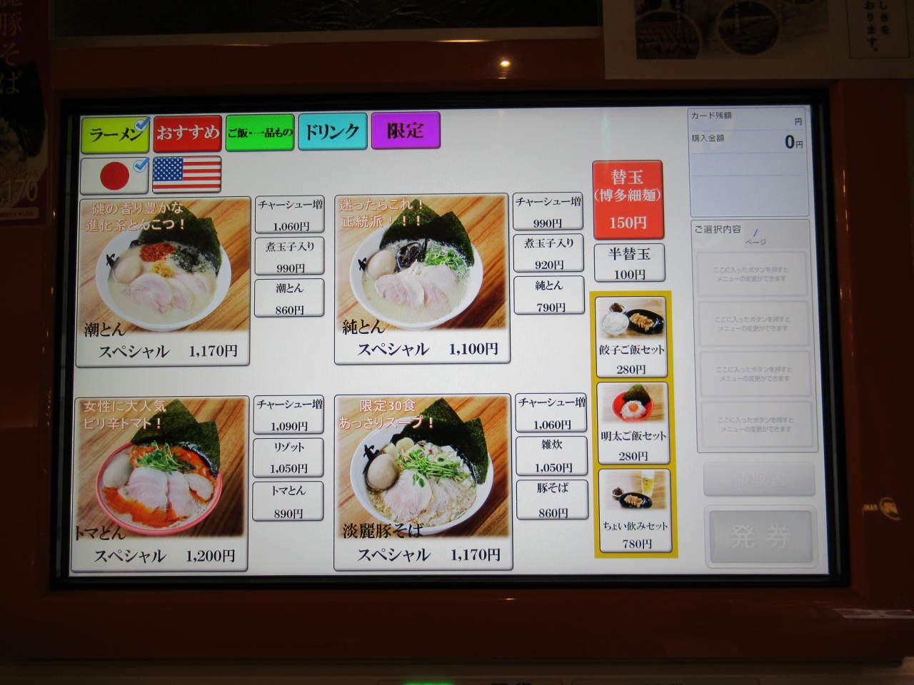 券売機で事前に食券を買う方式なのですが、同じラーメンでも最初に示されるのが一番値段の高いトッピング全部入りなのでついそのボタンを押してしまいそうになります。
