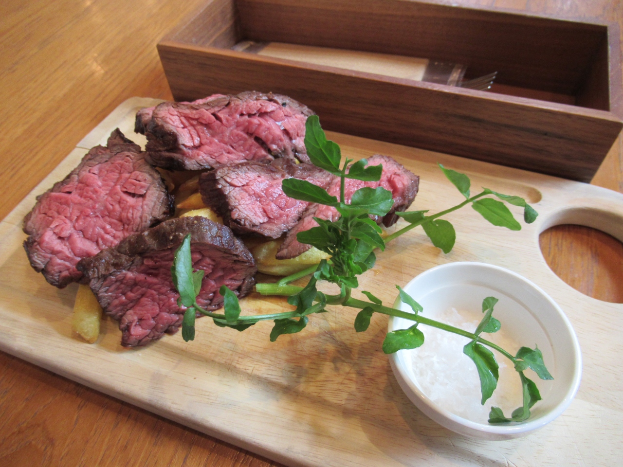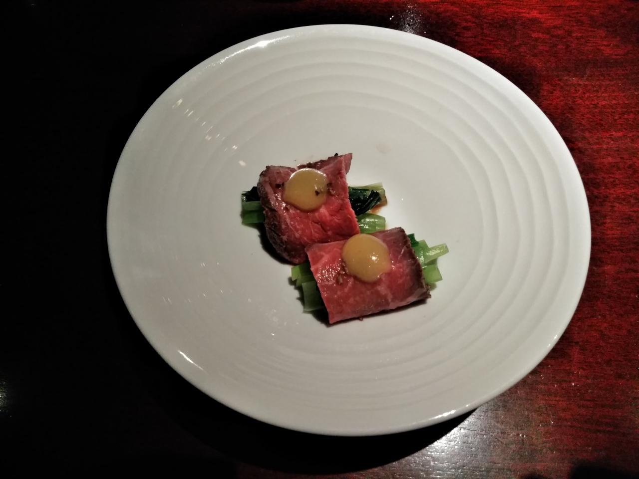 最初に、自家製ローストビーフの小松菜巻きが供されます。