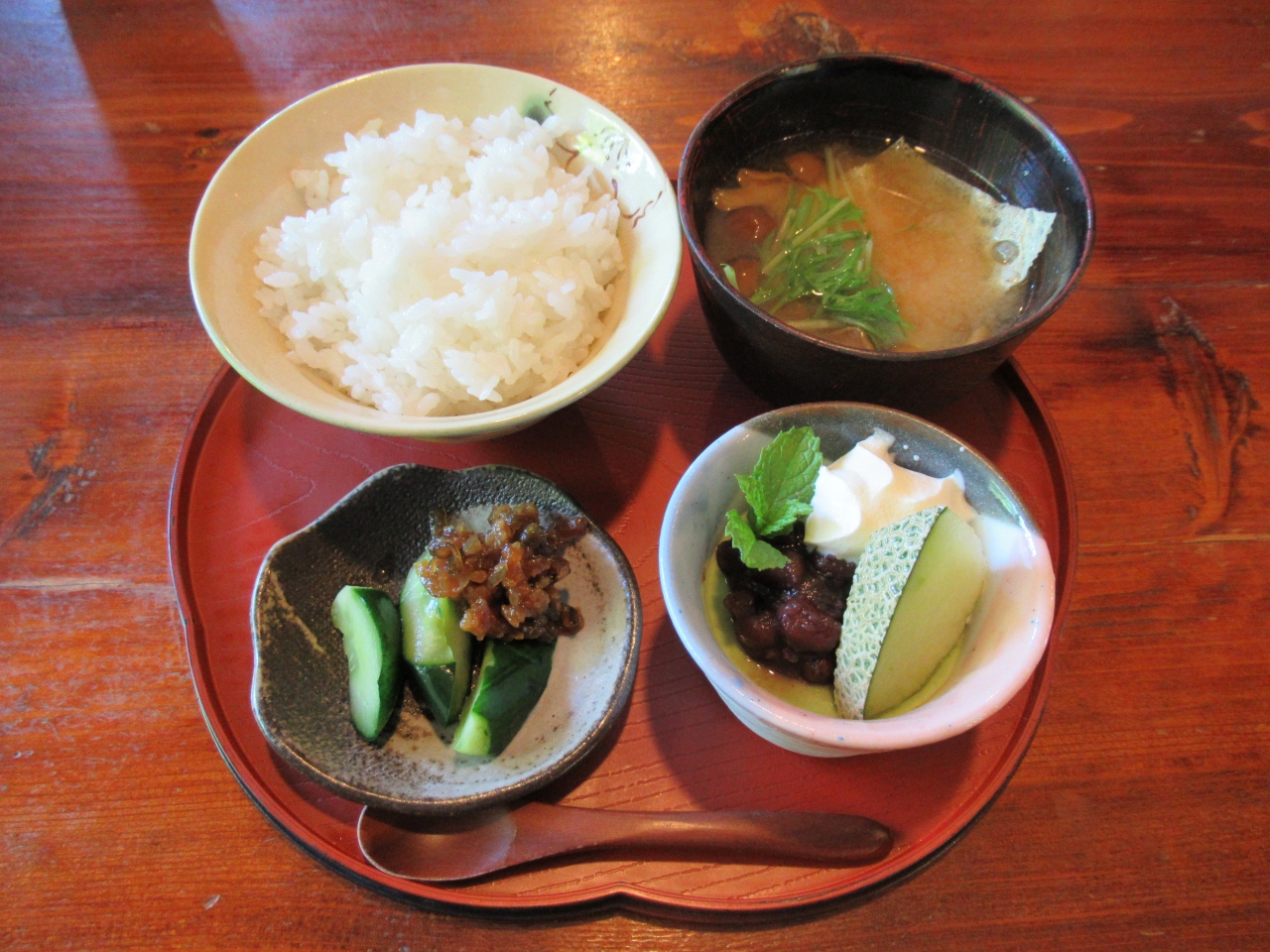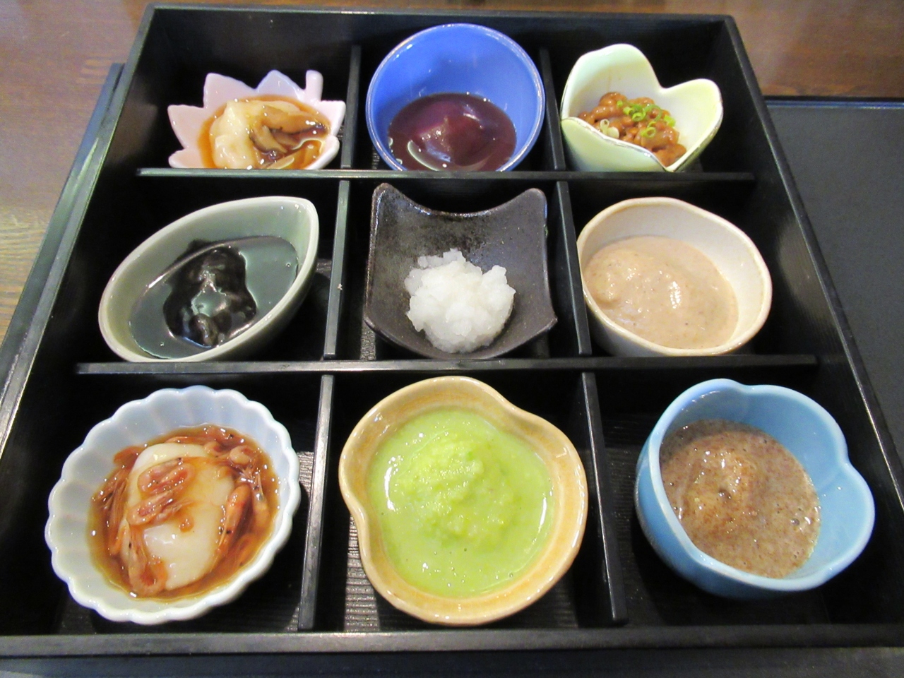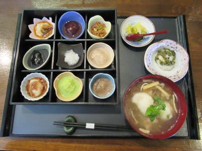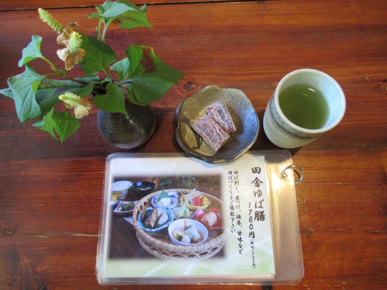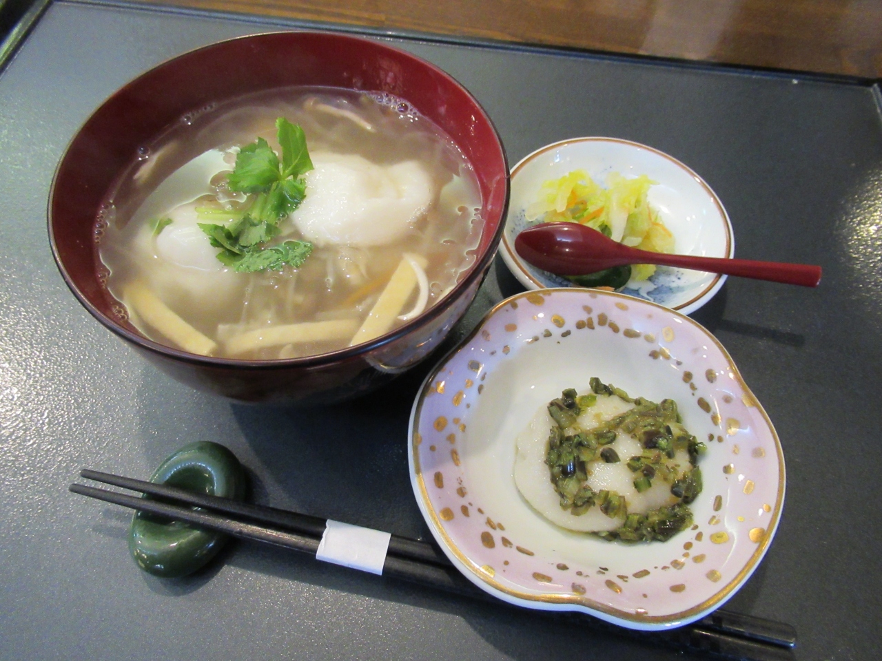 この日は写真の別皿の「わらび餅」(普通の甘い「わらびもち」ではなく、山菜の蕨を擂り潰したタレがかかったお餅)でした。