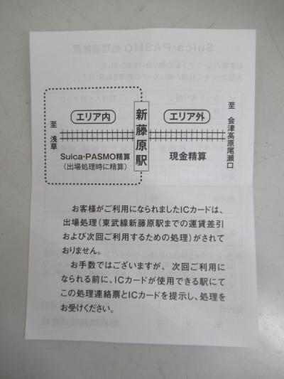 改札を出ようとすると「この駅は東武鉄道管内ではなく手前の新藤原駅から野岩鉄道なのでスイカは使えない」と言われ、野岩鉄道分190円を現金で支払いました。