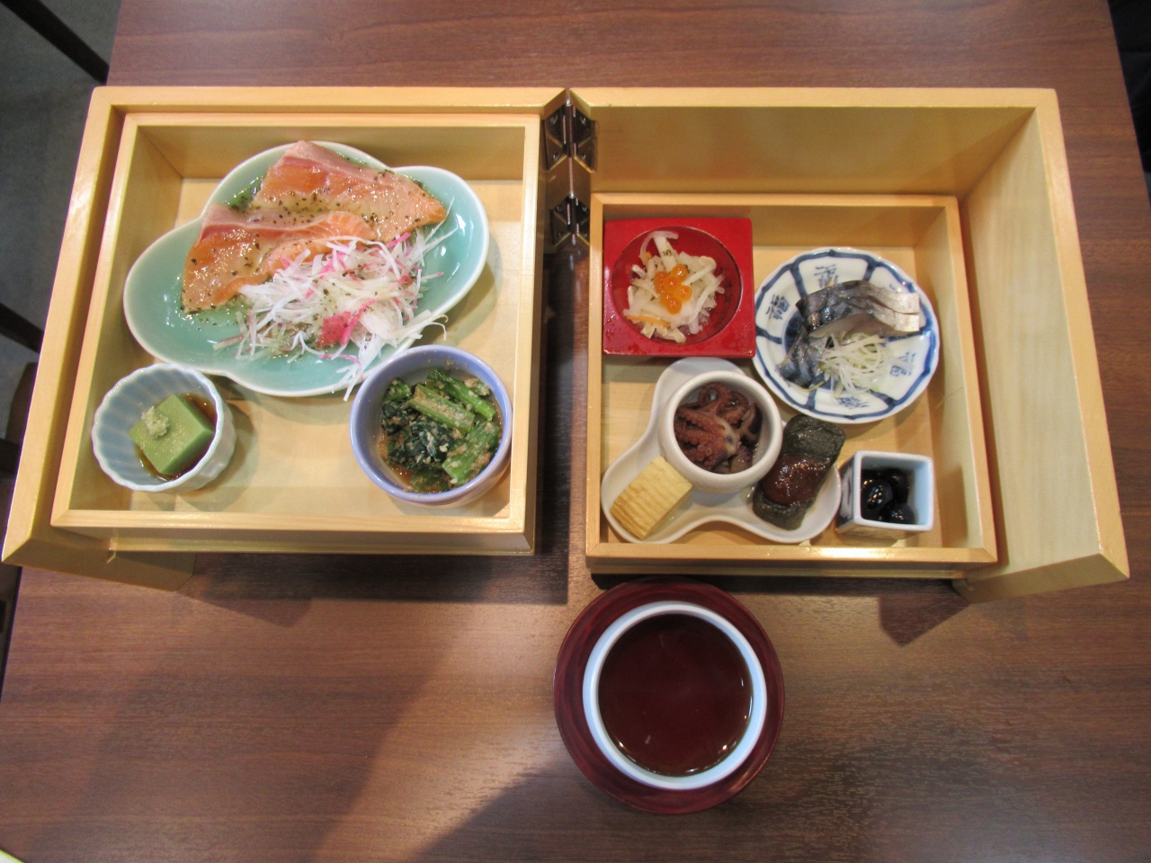 2段になっている箱膳や煮物、メインは勿論西京漬けの焼き物にちりめん山椒、デザートと続きます。
