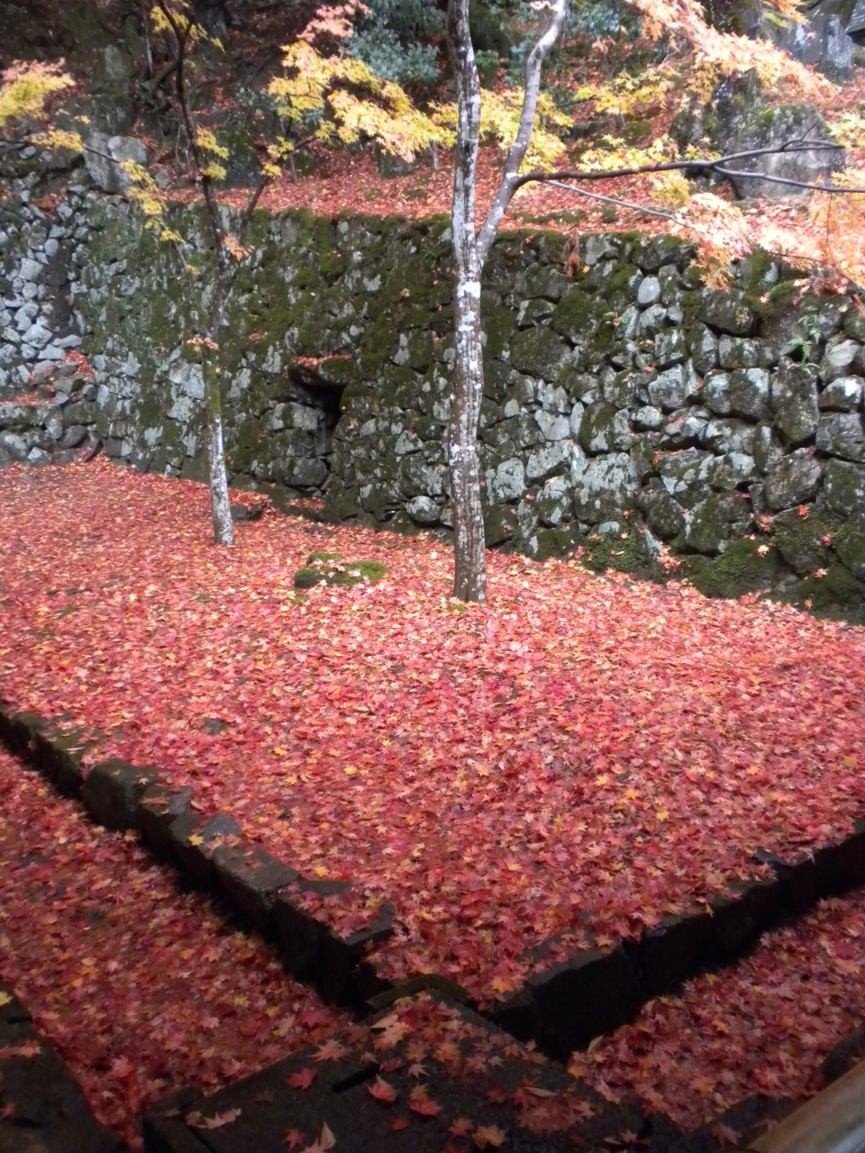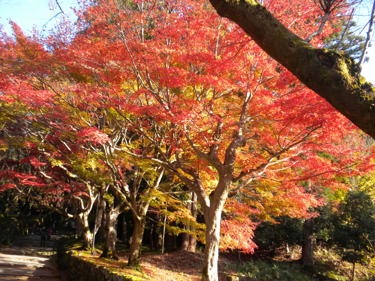 千体地蔵が両脇を固める石段の参道の先には、頑張って来た甲斐もある境内の「血染めの紅葉」が出迎えてくれます。