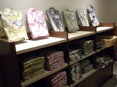 ①浴衣はフロント脇のコーナーで自由に柄とサイズを選べる。