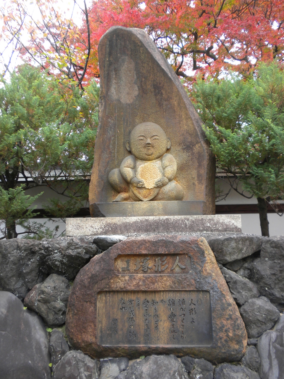 有料拝観エリアの手前に「人形塚」があり、背景の紅葉が綺麗でした。