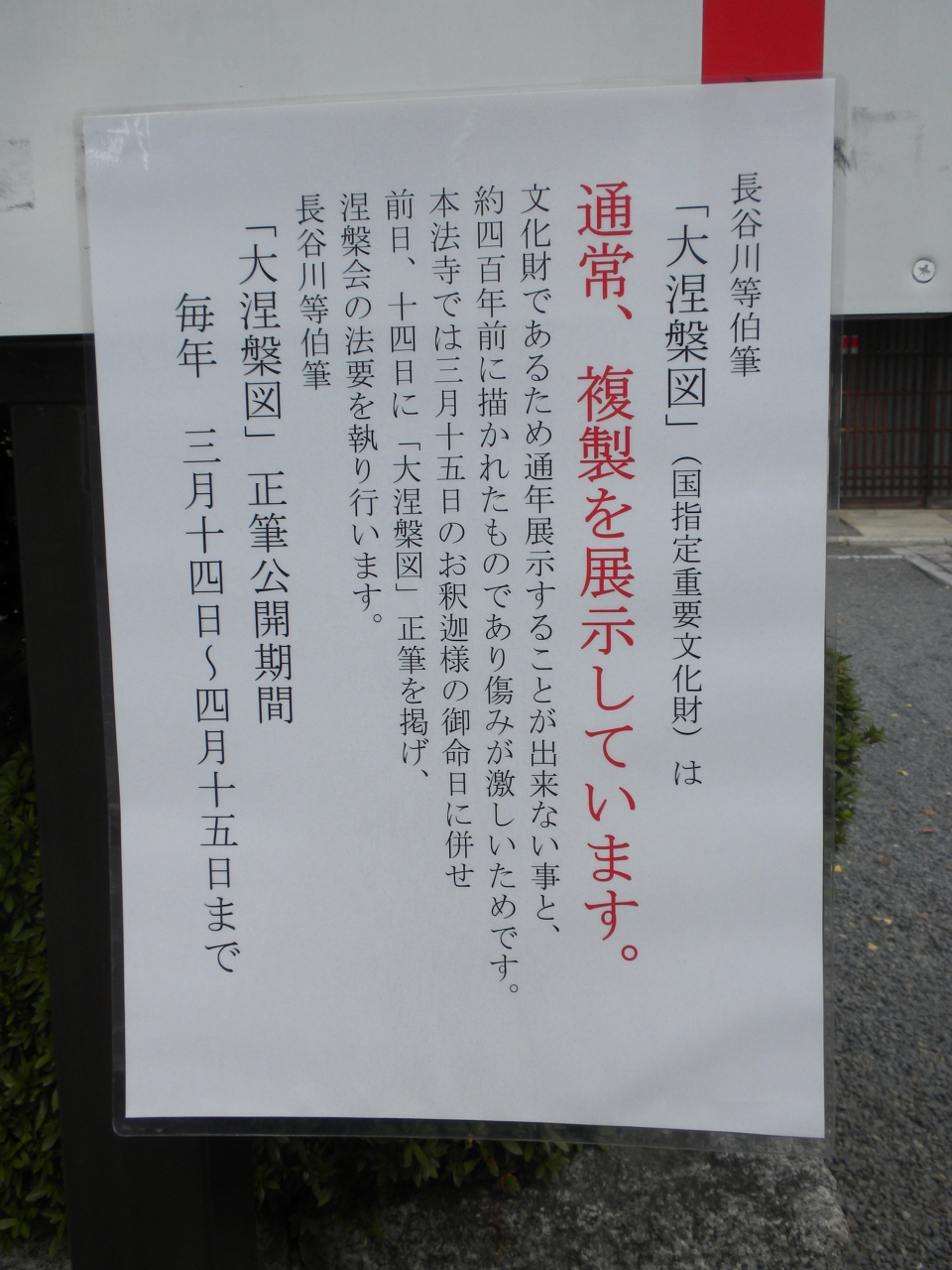 長谷川等伯筆「大涅槃図」の本物は3/14~4/15迄の特別公開で通常はレプリカ展示だそうです。