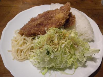 「一皿豚ミンチかつ」はメンチカツと御飯、付け合せの千切りキャベツとパスタがワンプレートで供されるものです。