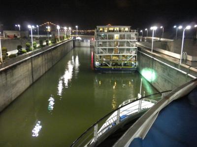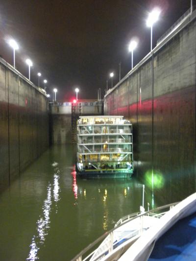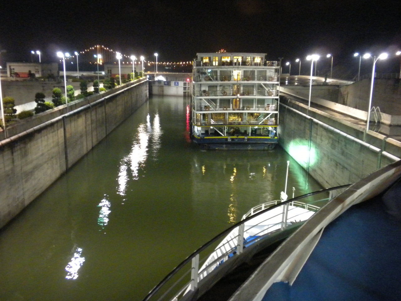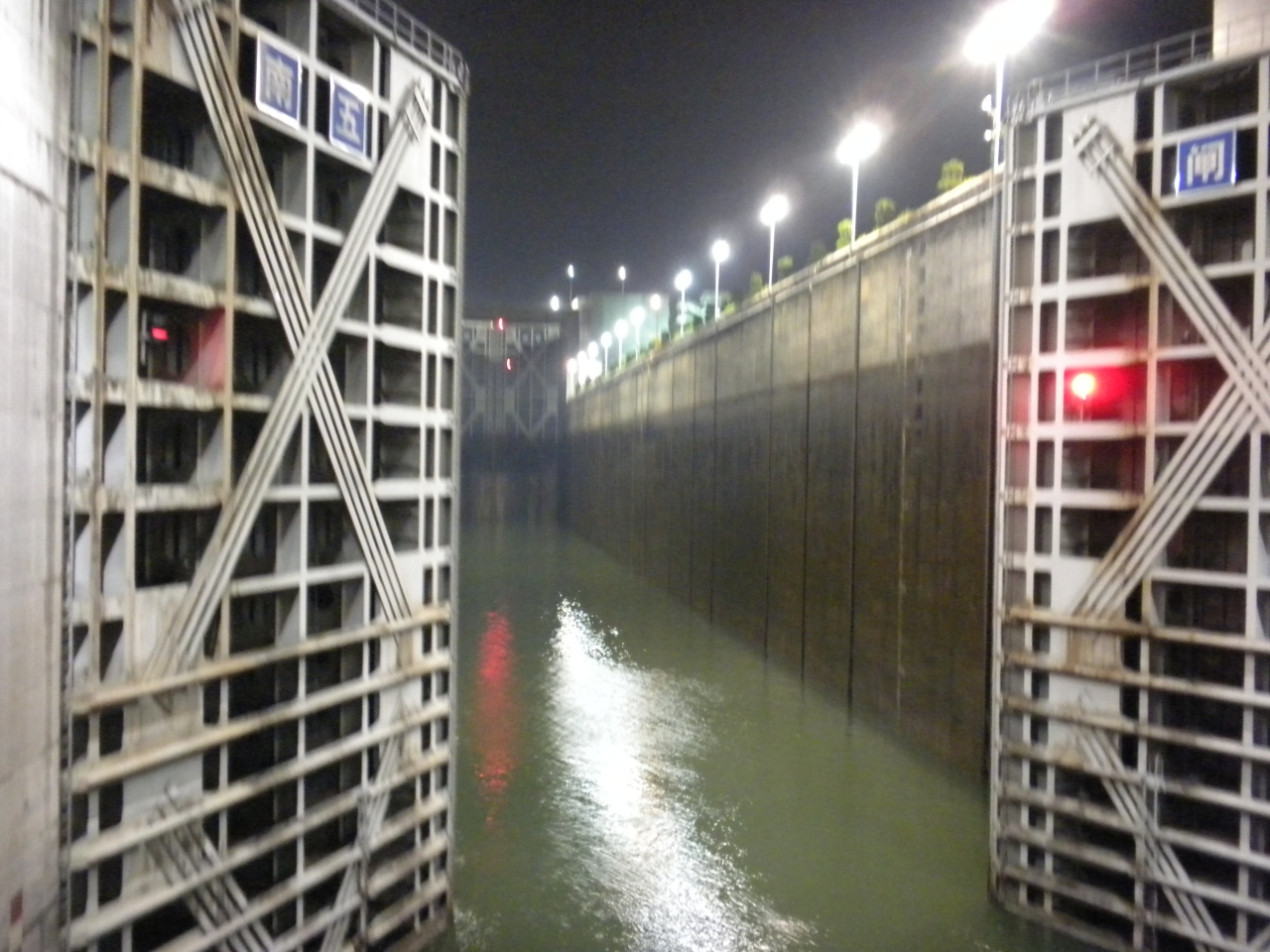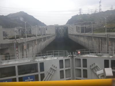 寝巻の上にコートを羽織り、急いで船の屋上に行ってみると、5段式ロック?の三峡ダムの水位の変化に船が刻々と対応していく様子が見られました。