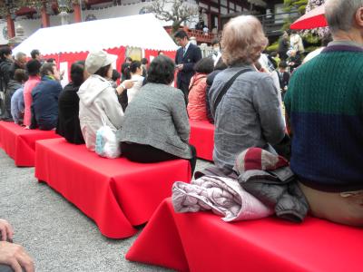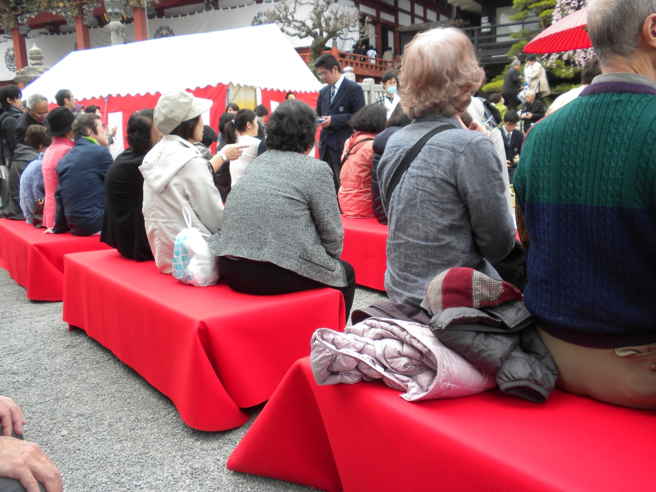祖師堂前の枝垂桜の下には、赤い毛氈を敷いた縁台が並び、観光協会と地元の高校生?に依る野点の抹茶と和菓子が無料で振る舞われていました。