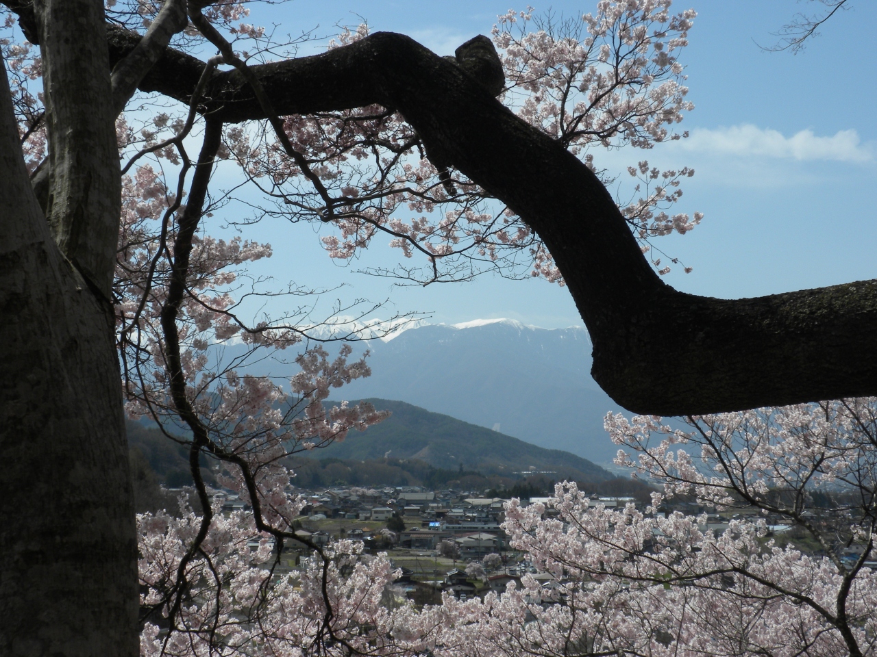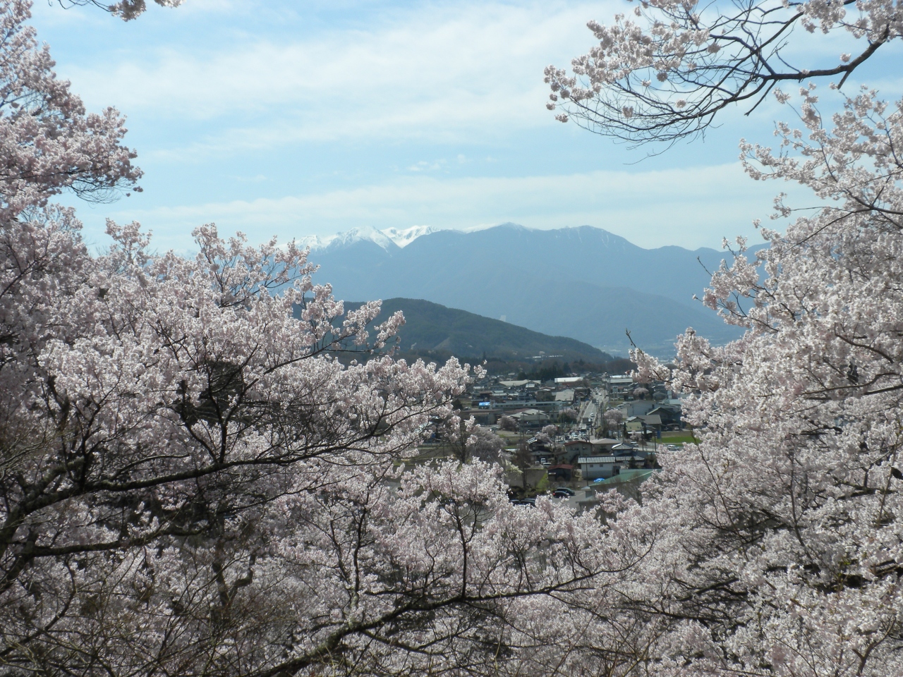 見晴台の勘助曲輪からは残雪を頂いた中央アルプスも遠望できます。