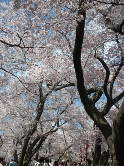 頭上を覆う一面の桜で空が見えないくらいですが、その隙間から覗く真っ青な空とのコントラストに花の艶やかさが一層際立ちます。