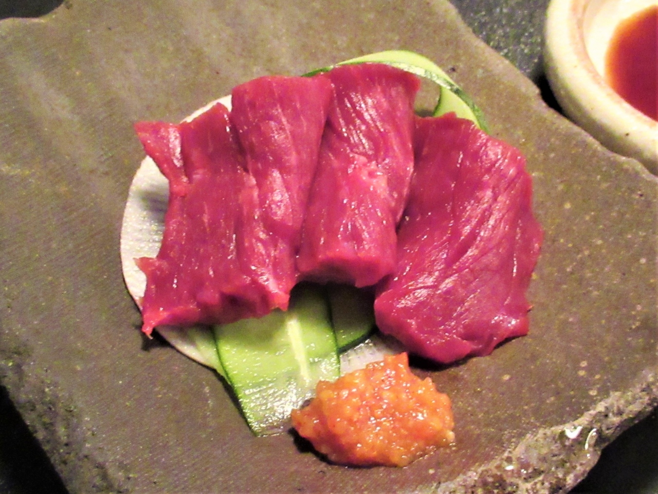 ⑨馬刺し(ロース)を田舎家自家製にんにく辛し味噌で。