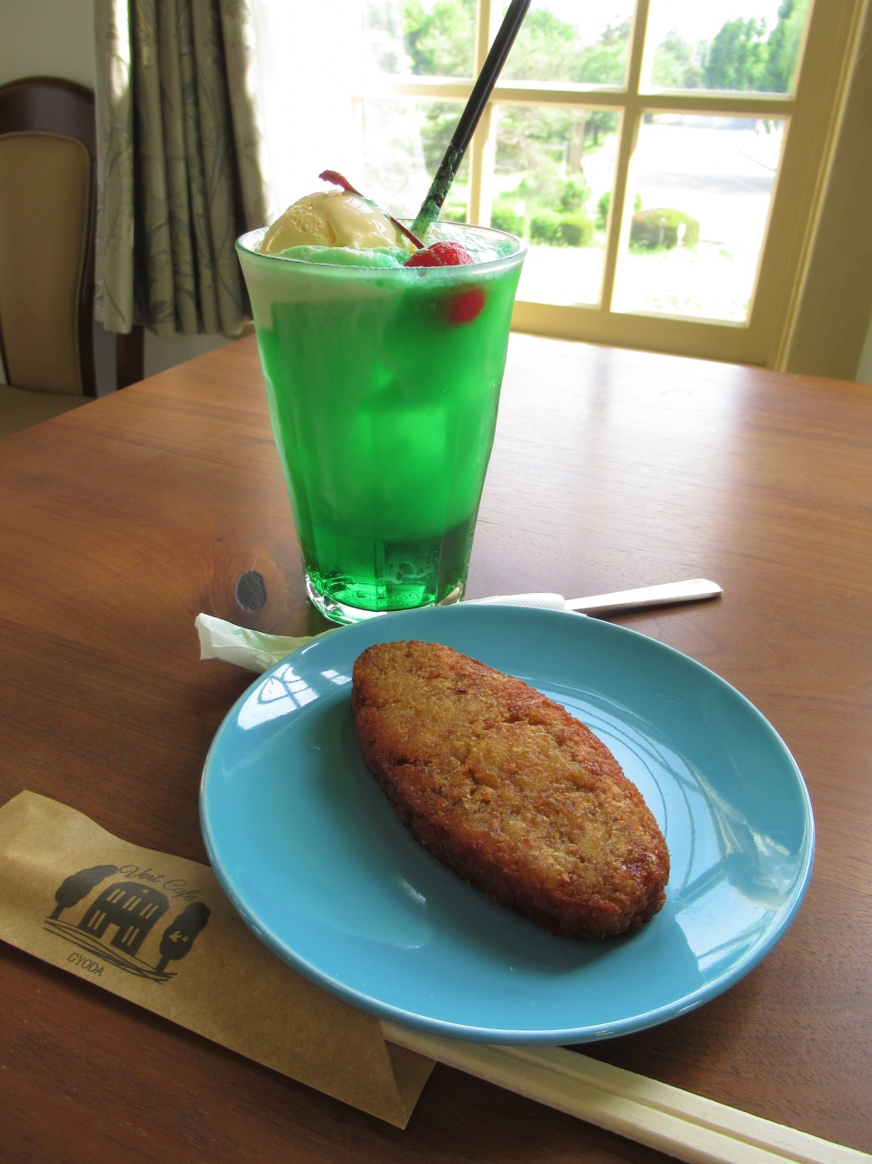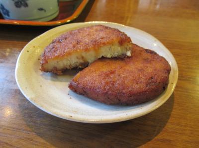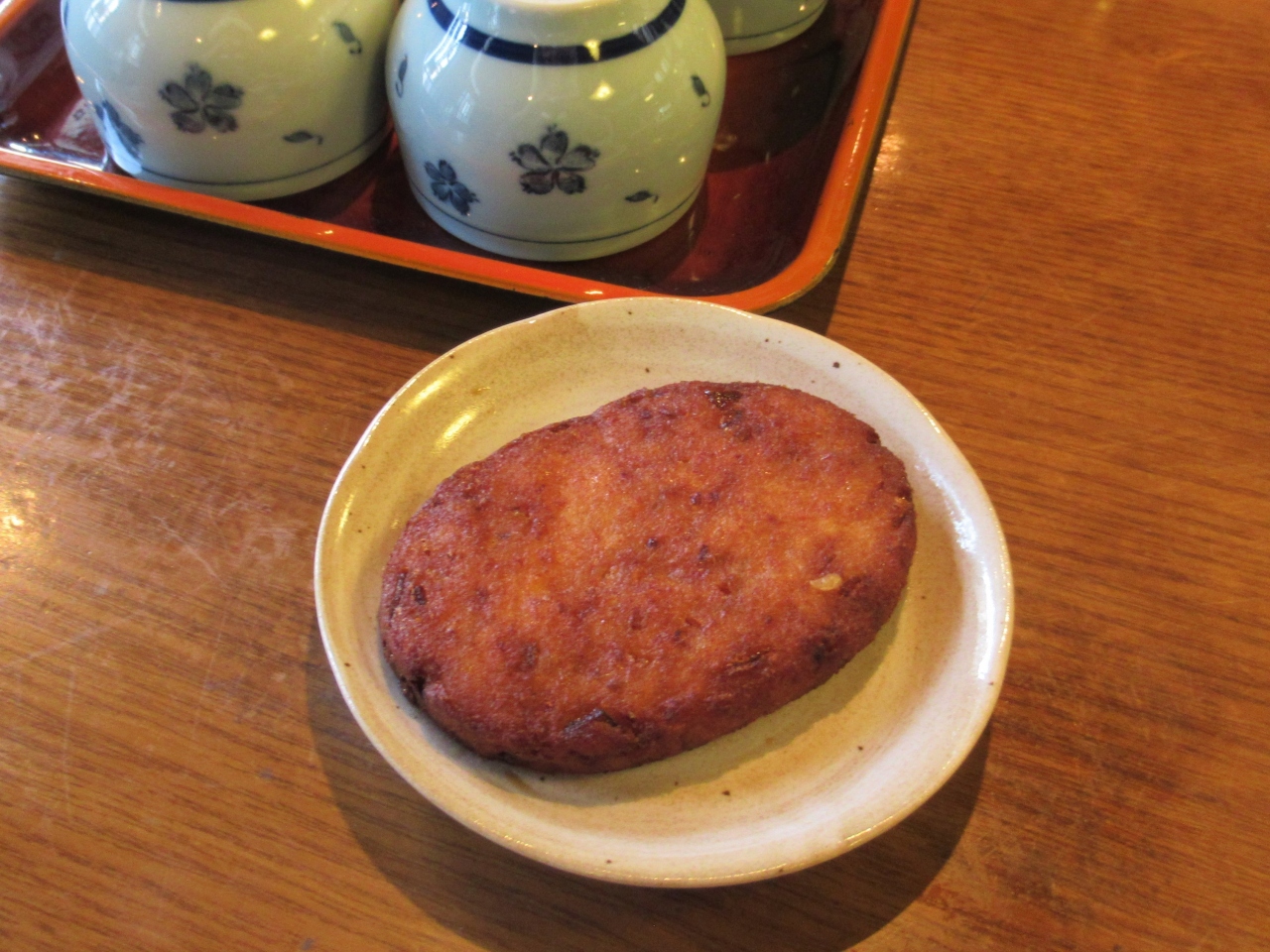 ゼリーフライは一人前2個200円ですが、食べ歩きも4軒目だし、一人だったので1個にして貰えました。