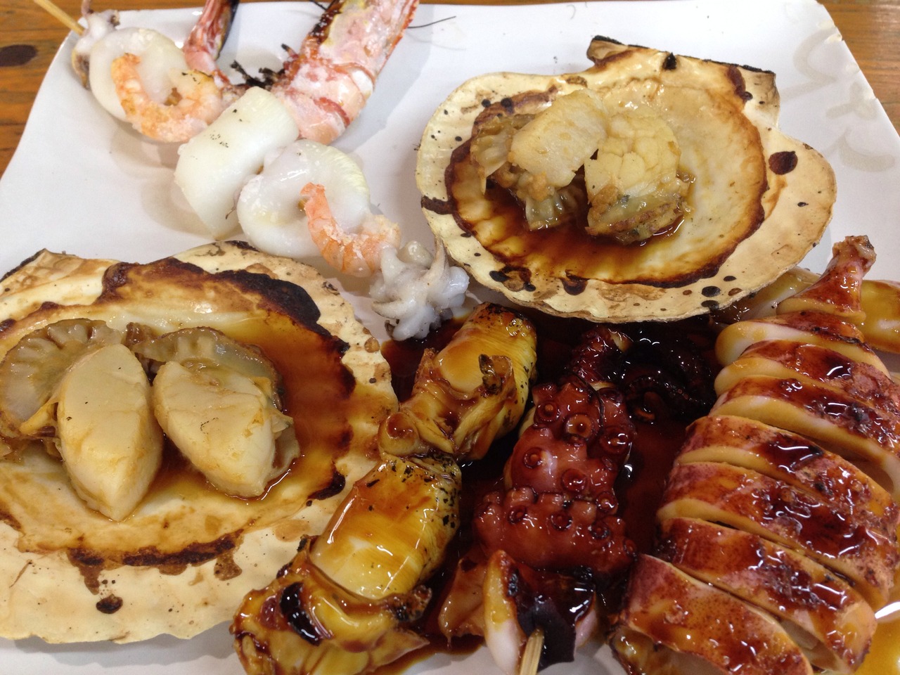 前回は海鮮丼のお店で並んで蟹丼食べたら、まーったく美味しくなかったので、今回は海鮮市場で海鮮を買って、その場で焼いてもらう…というシステムで食べました。フードコートの場所取りをして、ビールはお寿司さんで買って来ます。海鮮は調理ができると渡されたカードの名前で呼んでくれます。「サザエさーん」とか(笑)
