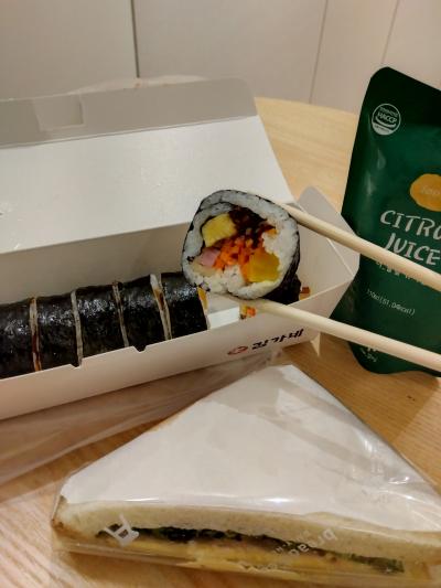 移動で疲れてしまい、キムガネでキンパをポジャンしてお夜食にしました。