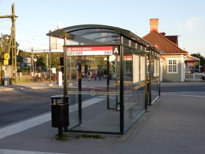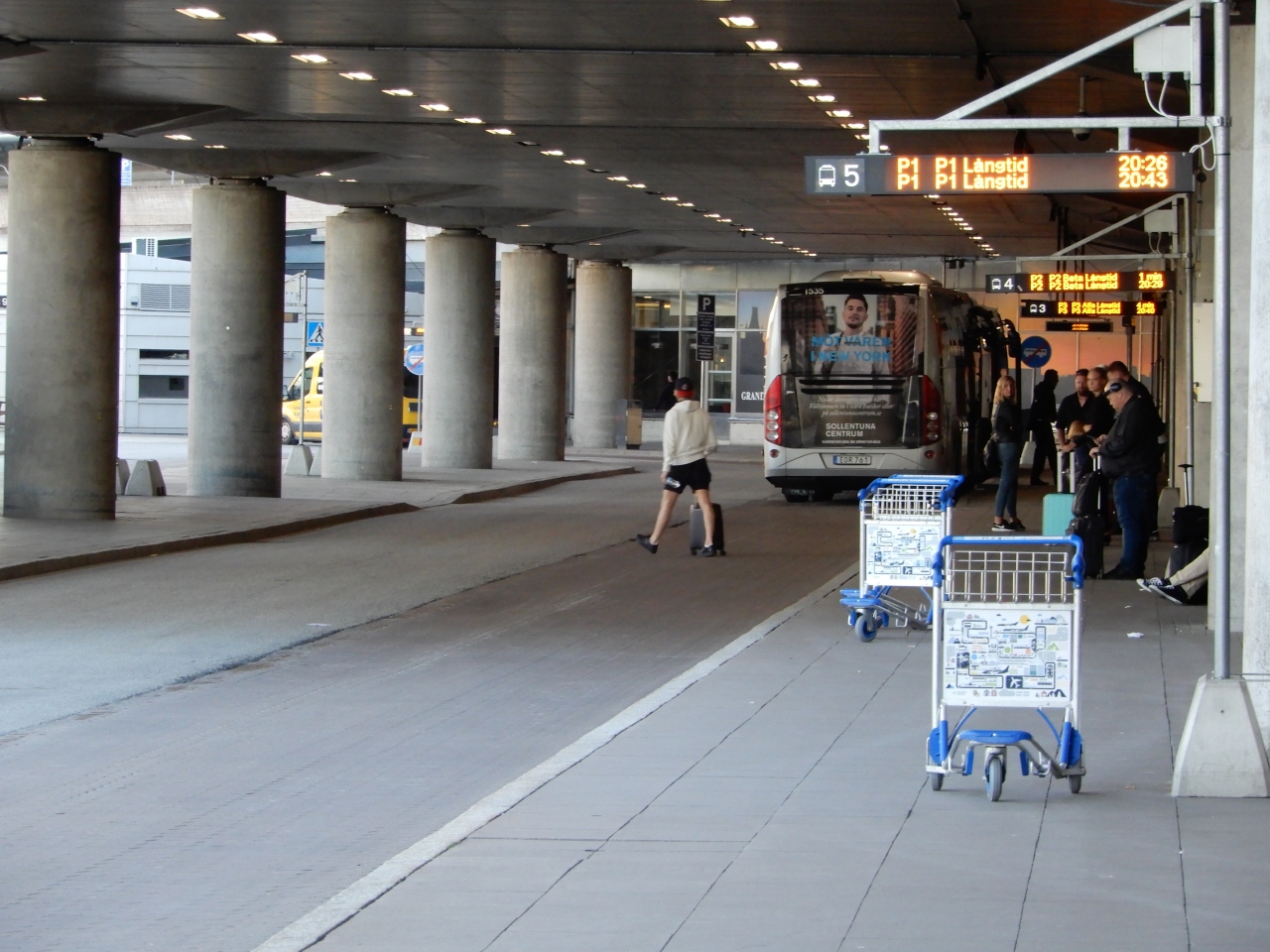 そこで、トラベルカードを活用して、まず空港からの路線バス583番(30分に1本あります)で、コミューター・トレインの別路線(41番と42X番)が出ている「メーシタ駅」に移動し、そこからホテルのある「ソレントゥーナ(Sollentuna)駅」まで移動することにしました。これなら特別料金がかかりません。路線バス583番のバス停は、到着ロビーのツーリスト・インフォメーションの向かい側出口を出て、左に進むとすぐあります。