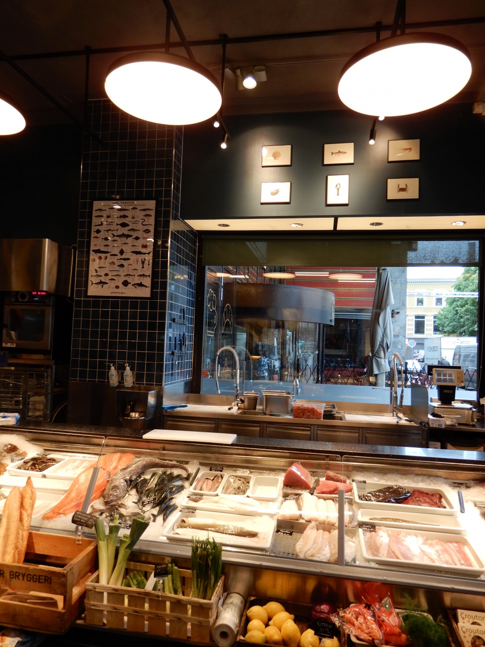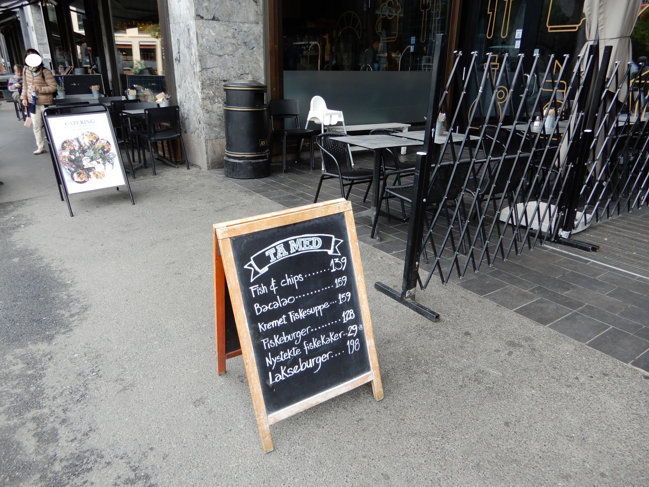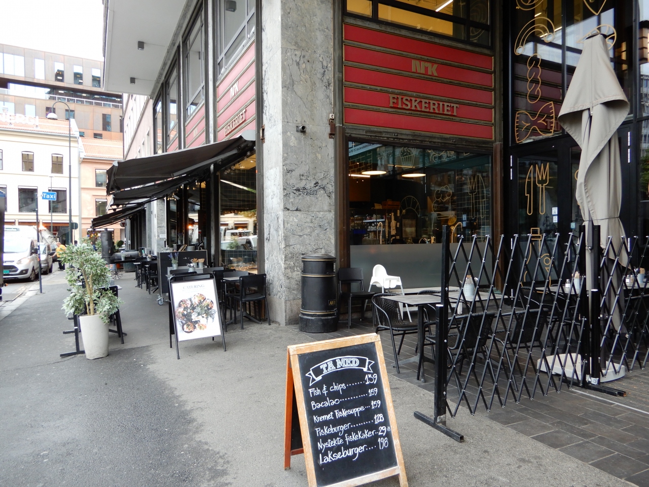 老舗の魚屋さんがやっているレストラン。店内には新鮮な魚介類が並んでいます。(もちろん販売もしています)店外にはテラス席もあります。近くのサラリーマンもよく利用しているようですし、テイクアウェイもできます。テイクアウェイは、店内価格より1品30~40NOK程度安くなっています。