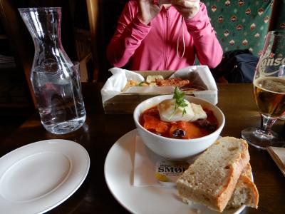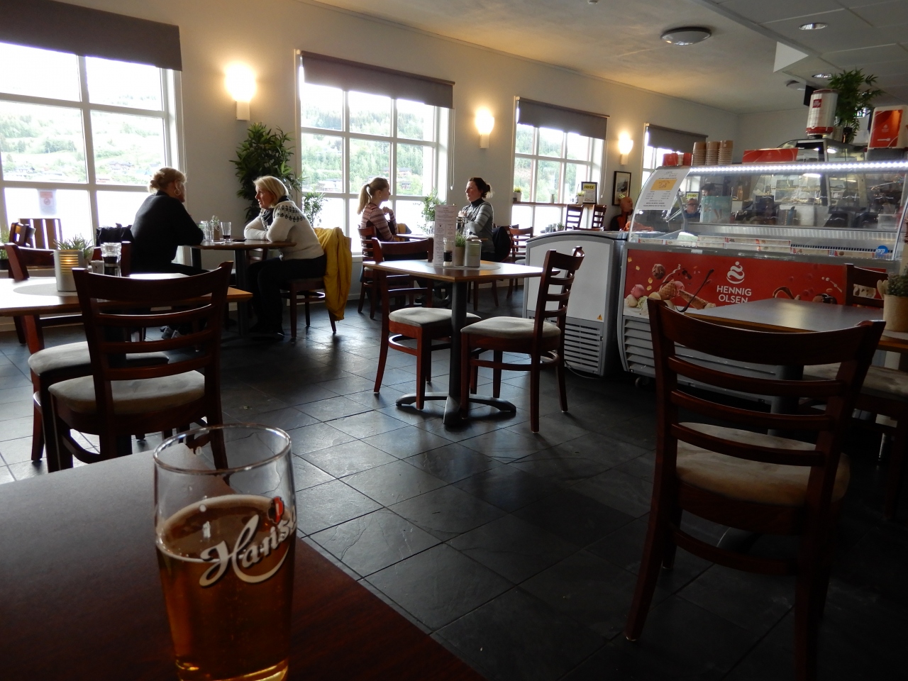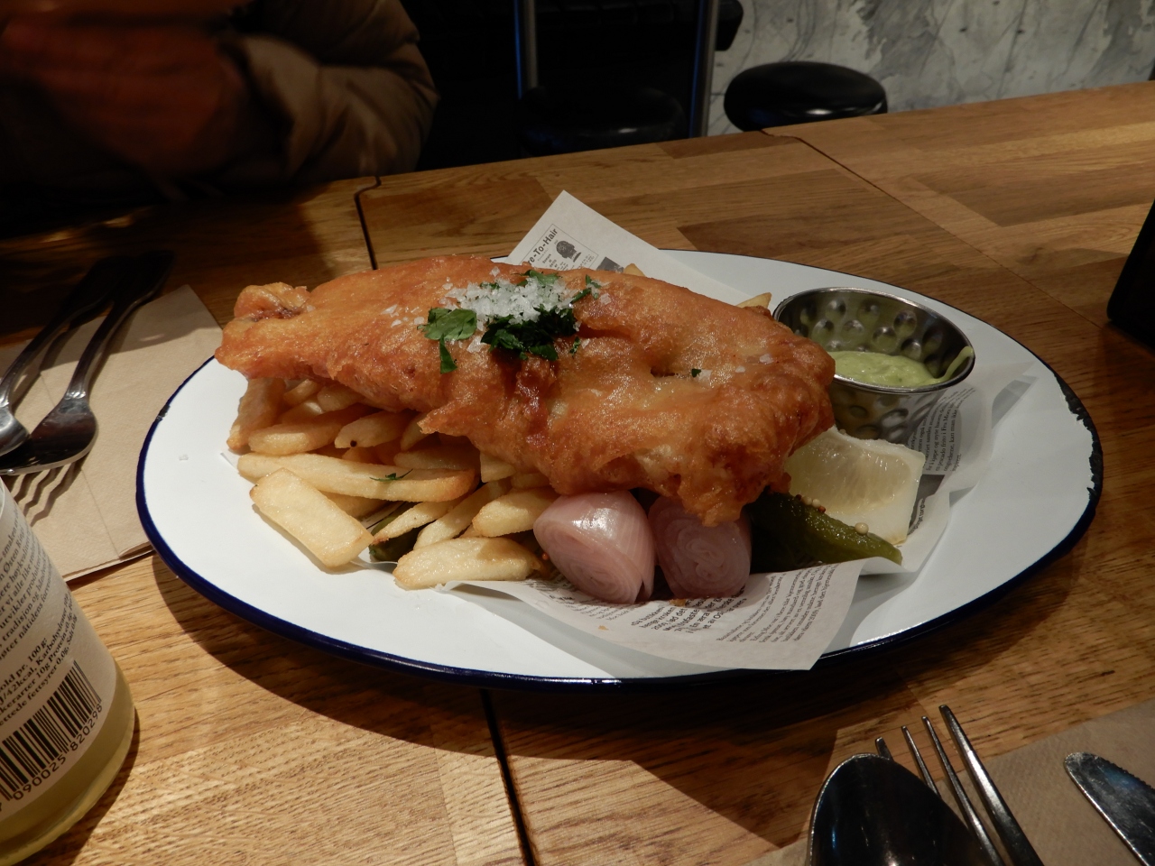 料理は、「クリーミー・フィッシュスープ」と「フィッシュ&チップス」を頼みました。フィッシュスープが絶品です。ハダンゲル・フィヨルドのウルヴィクのカフェで同じものを食べたのですが、どちらも甲乙つけ難いほど旨かったですね。フィッシュ&チップスも何度か食べましたが、これも外れはありません。やはりノルウェーは魚介類が旨いです。