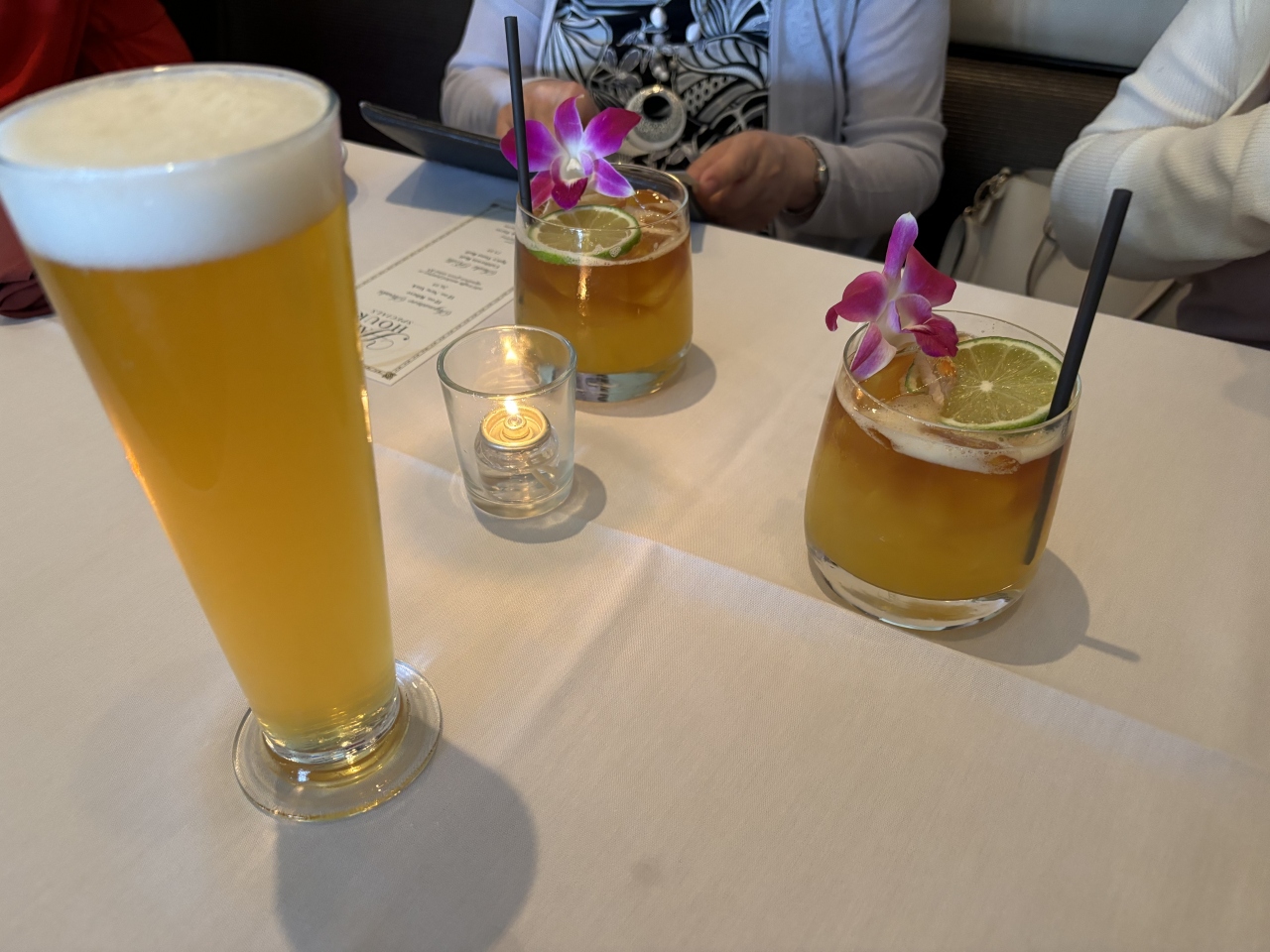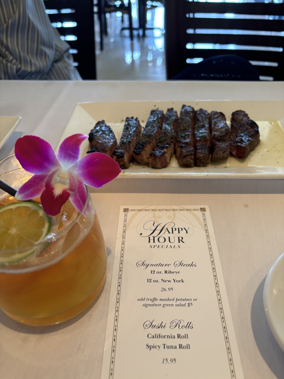 席に案内された途端に、ウェイターの方から、「ハッピー・アワーのスペシャル・ステーキならすぐに用意できるから、お勧めだよ」と言われて、「リブ・アイ・ステーキ 12オンス(26.95ドル)」を2皿、「ホタテのカルパッチョ風刺身(17.95ドル)」を注文。飲み物は「ハワイ・コナ・ブリューイング IPA」1杯と「マイタイ・カクテル」を2杯注文。