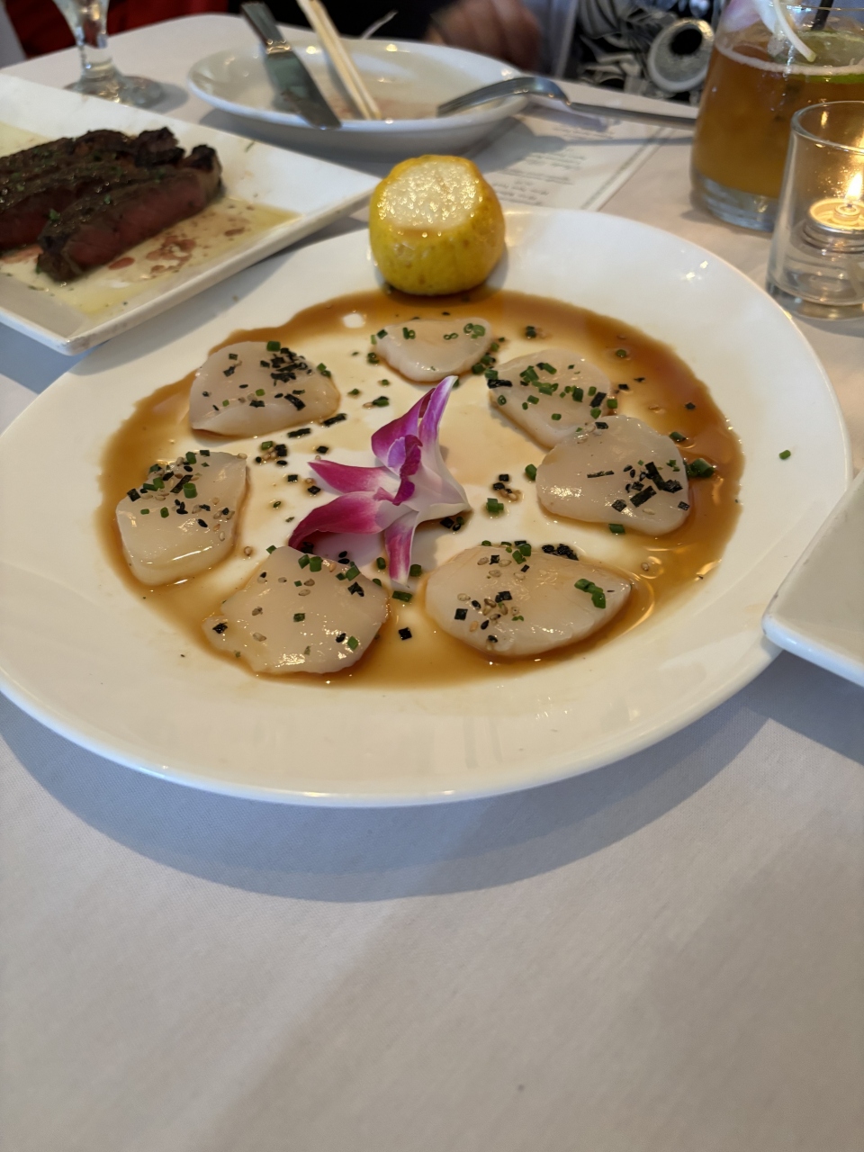 ステーキは、ちょっとスパイシーですが、柔らかくてとても美味しかったです。ホタテも期待どおりでした。チップ含めて3人で138ドル。コストパフォーマンスも良く、36階からの景色も楽しめました。