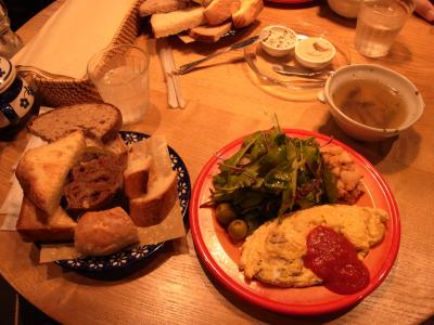 パンの豊富さもすばらしく、ゆったり食事も可能です。好きなパンを取って、サラダや飲み物と組み合わせるセットがメインですが、パスタも2種類、限定20食で用意していました。