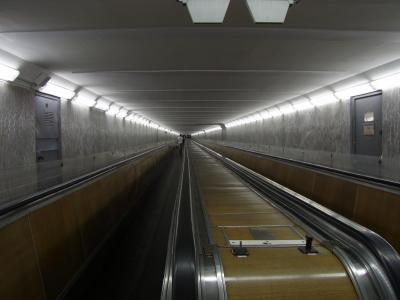 メトロはとにかく深いです。エスカレーターにかなり長い時間乗ります。日本だと、何回かエスカレーターに乗りかえると思いますが、とにかく一本。いったん27R(2012年7月時点)でコインを買えば、乗り換えは自由です。青い電車がなんだか、なつかしいような、けれどいかにもロシア製といったところです。