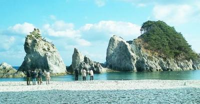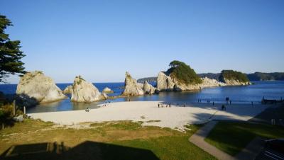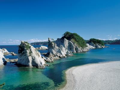三陸復興国立公園内。火山岩の白い岩と小石で本当に白くてきれいです。ここが浄土と名付けられたのが分かります。外海と隔てられているのでとても穏やかです。夏には海水浴もできるそうで、日本の海水浴場88選や日本の快水浴場百選にも選ばれています。