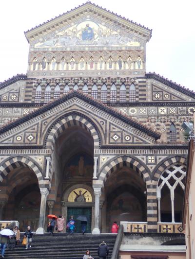 アマルフィは青く澄み切った海と崖にへばり付く白い家々がとてもきれいです。陽光を浴びるとそれはとてもきれいです。海岸からは真っ直ぐな通りが登坂になっていて、両側に色々な土産物店、レストランがあります。レモンが特産品で何書類ものお土産があります。レモンもとても大きくてびっくりしますよ(露店でレモンが沢山売ってます、アマルフィに入る手前の写真ポイントの場所です)。ドゥオモが一番大きい建物です。小さな町です。