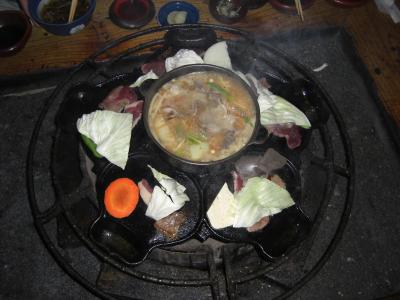 ここの牡丹鍋(ししなべ)は最高です。絶品でした。雰囲気も良いし囲炉裏で居心地が良かった。写真は、真ん中が牡丹鍋で、周りで鹿肉と鴨肉を鉄板焼きにします。