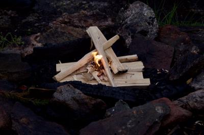 ガイドさんのお手本のあと、参加者もナイフと火打棒、そして木材を渡され、...