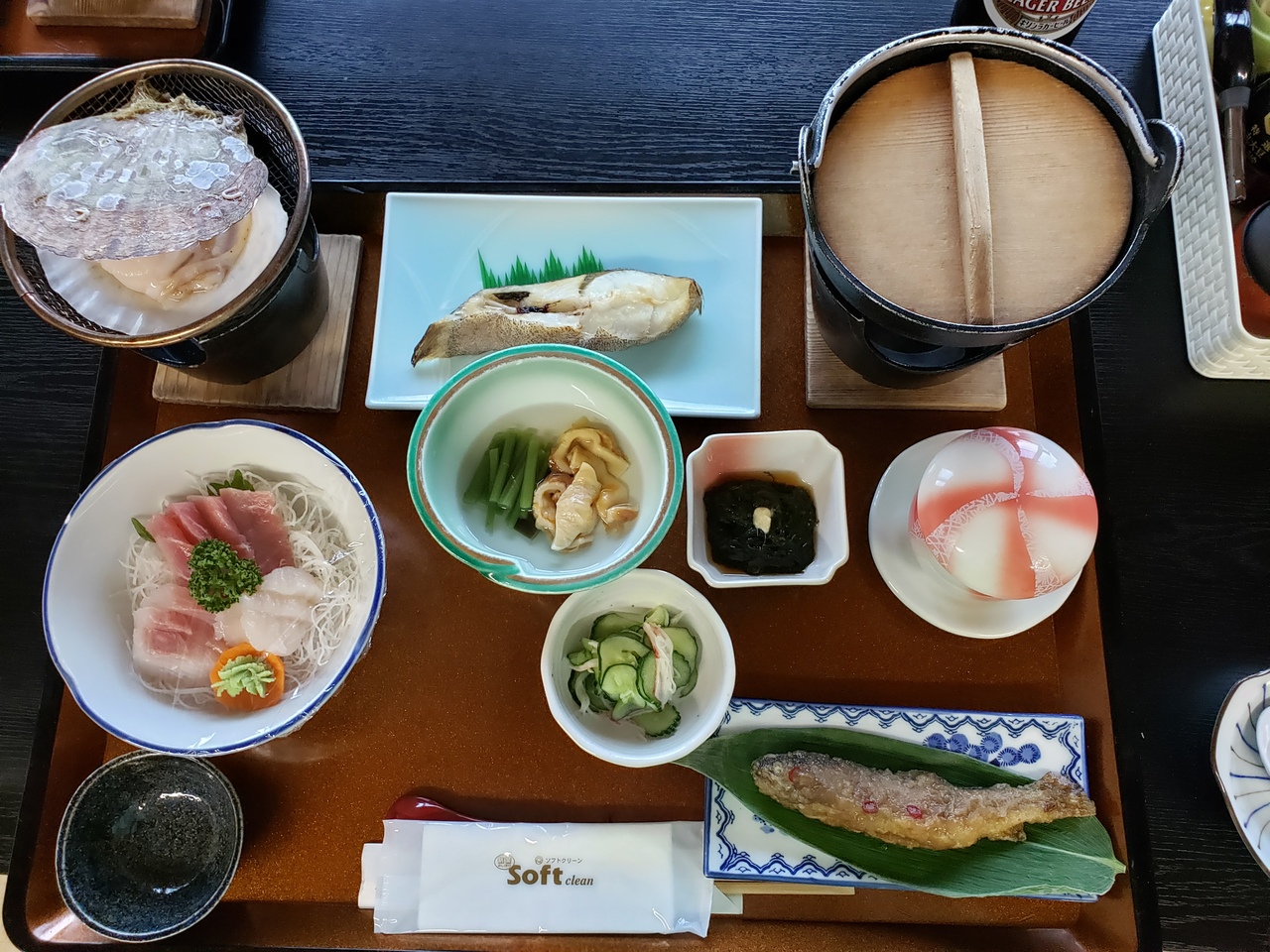 津軽半島の今別に行く用事があり宿泊しました。今別から25分ほど青森方面に戻ったところにある温泉旅館です。部屋は古いほうですが食事のコスパはいいです。夕食はホタテのバター焼きと塩味の鍋ですが、この鍋がすごく美味しいです。