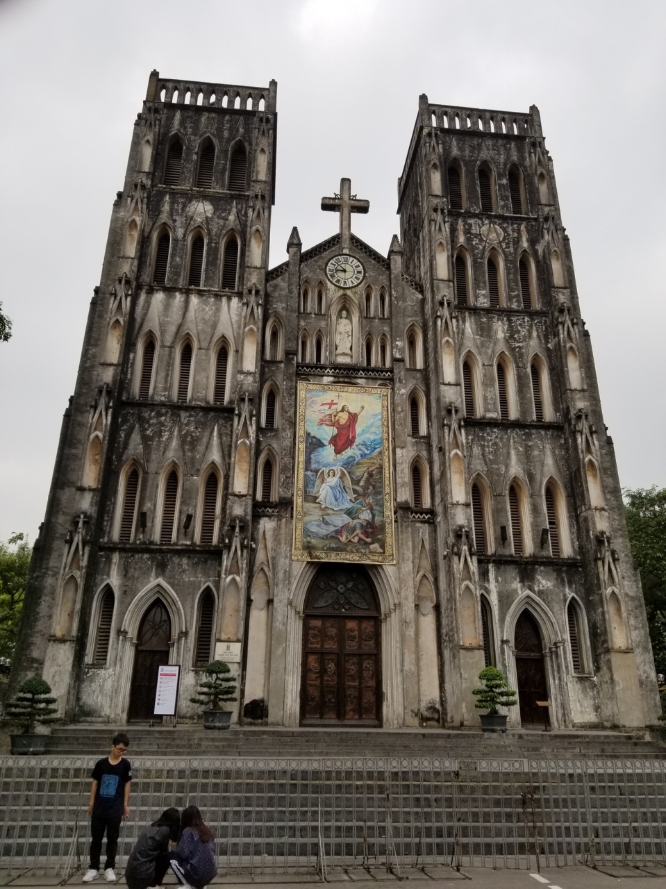 ベトナムのハノイに行ったとき大教会に行ってきました。ハノイといえばハロン湾とホーチミン廟と定番の観光スポットです。ちなみに入口は正面からではなくて左の方から入ります。夜はライトアップされてキレイです。