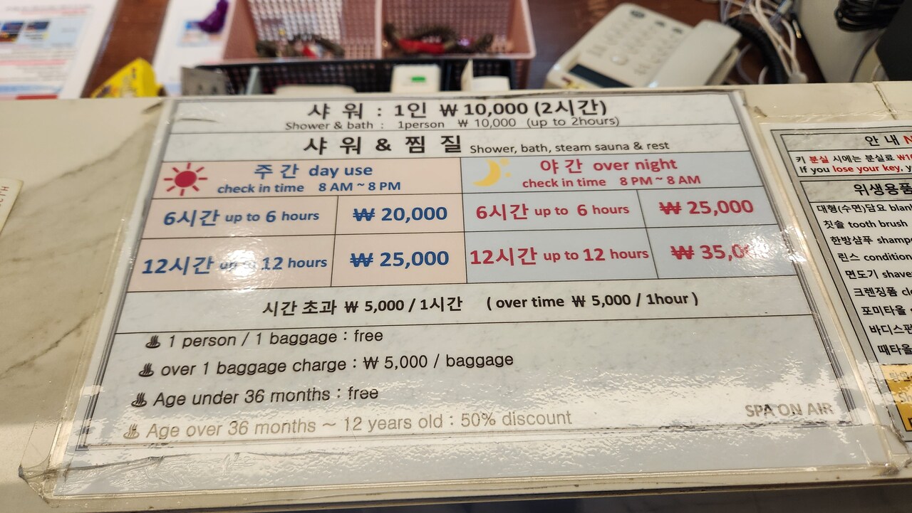 チェックインまで時間があったので風呂に入りに来ました。シャワーと風呂だけであれば10000ウォンでした。タオルは二枚貸してくれます。風呂の湯船は3つありましたが、37か38度でぬるかったです。シャワールームは9つほどありました。