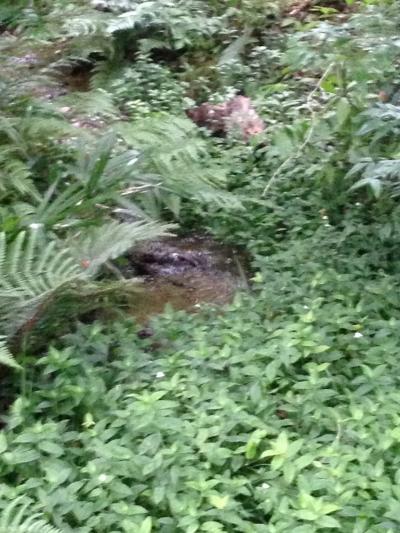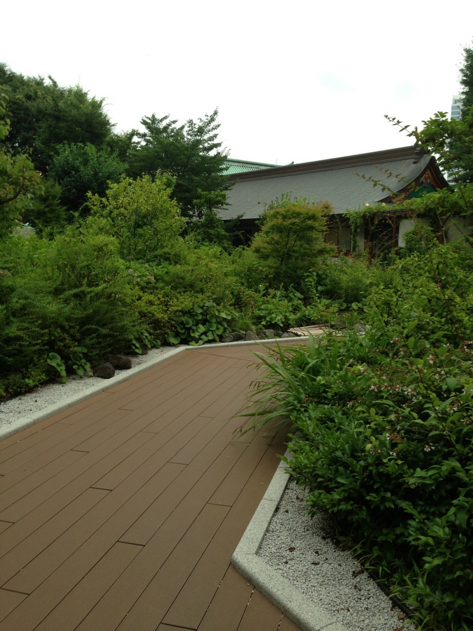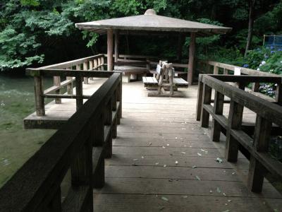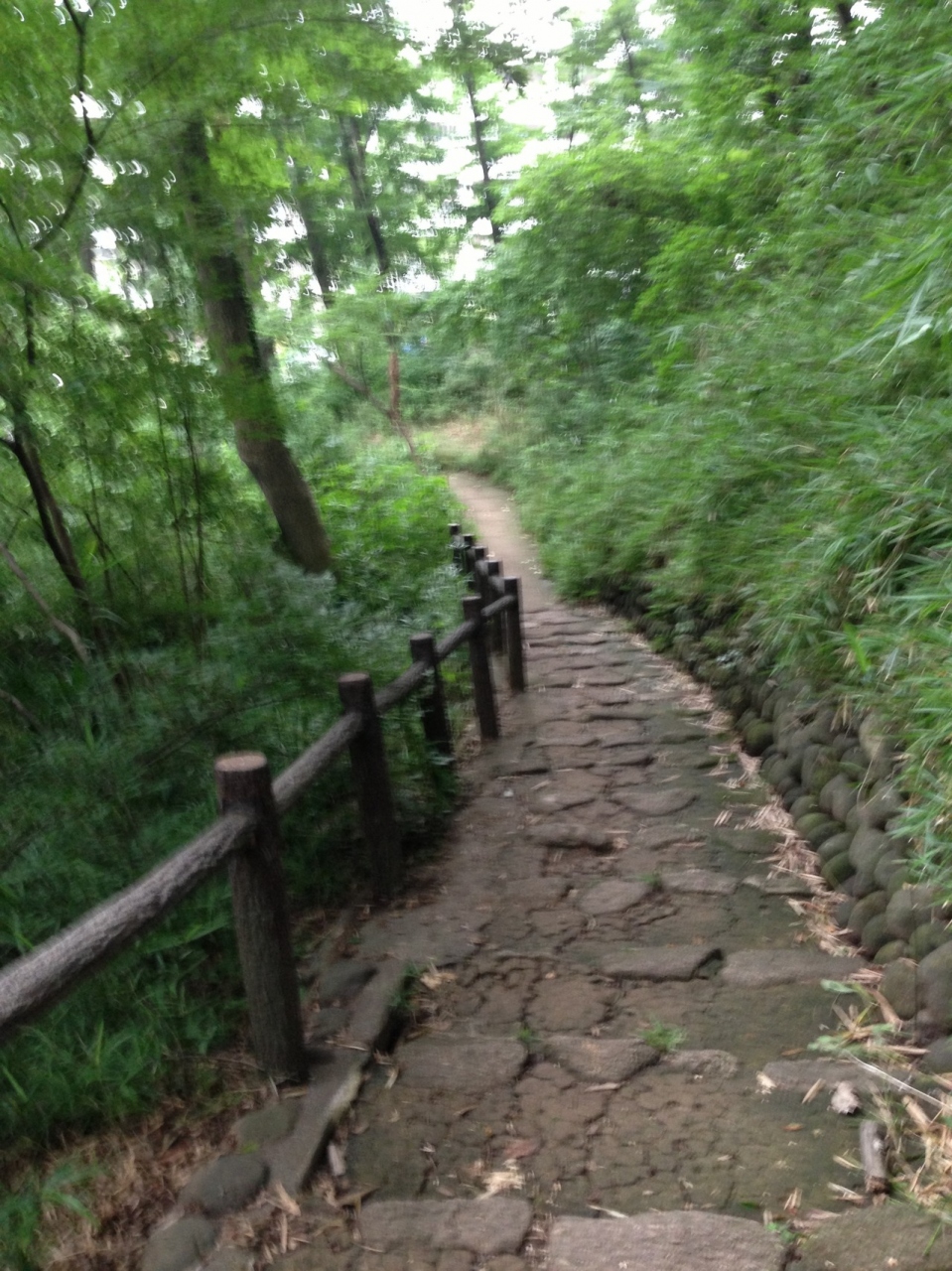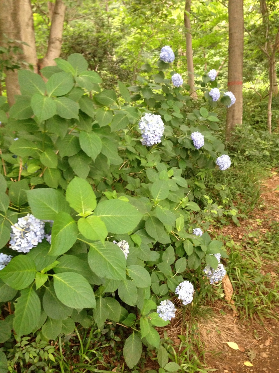 日野の住宅街のなかにとつぜん鬱蒼と茂った木々が見えます。小径に入ると、山の中のような涼気。小鳥のさえずりも聞こえますが、ときおり中央線の電車が走って行く音がします。せせらぎがあり、季節の花が咲いています。