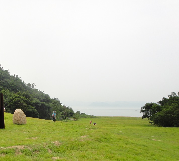 地中美術館というだけあって地上からは野原が見えるだけですが、地中には安藤忠雄の建築による美術館が広がっています。
