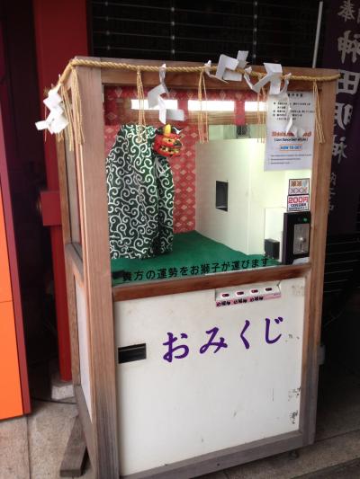 おみくじの自動販売機に獅子舞がのっていて、記念写真撮影用の顔を出せるようになっている立て看板もあります。