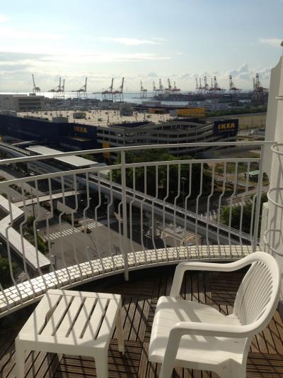 そして部屋もとてもきれいでした。お風呂と洗面台がそれぞれ別になっています。またベッドのファブリックも上等のものでした。さらに部屋の中には書類を見たり書き物したりするのに適した机とくつろぐのに適したテーブルがありました。ベランダにもテーブルと椅子がありました。ベランダからは神戸港が見渡せて素晴らしい眺めです。