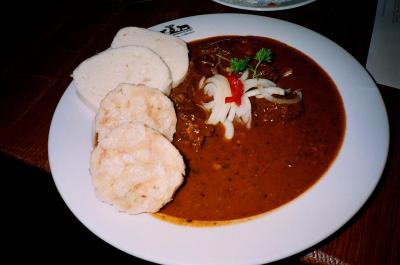 私達は1階の窓際で「ローストポーク+ローストダック+ザワークウト+クネドリーキ」という一般的な盛合せの皿とブダペストでハマッたグヤーシュ♪前菜にプラハ・ハム♪をオーダーして、ビール2杯と合わせて1.500円でした(驚)