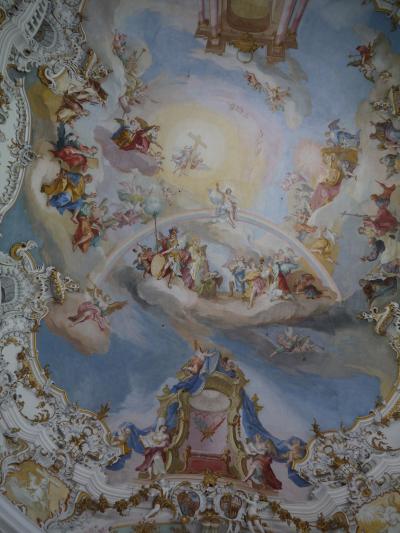 世界遺産の奇跡のヴィース教会です。個人旅行では行きにくい場所にありますが、ヨーロッパバスに乗ると途中下車で一時停止する間に軽く観光出来ます!若しくは現地ツアーでノイシュバンシュタイン城とセットで廻るのが便利だと思います。シンプルな外観に比して内部は豪華絢爛で素晴らしい教会となっています!その成立ちを知ると、シュタインガーデン修道院の修道士が彫った「鞭打たれるキリスト」の木像が涙を流したそうで、教会側はこの奇跡を認定しなかったが噂を聞きつけた巡礼者は増える一方で、教会は大幅に改修され現在に至ったそうです。